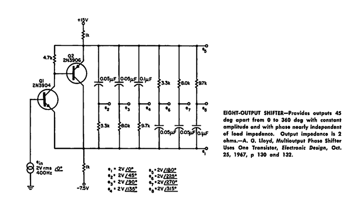 SOURCE: A. G. LLOYD, "MULTIOUTPUT PHASE SHIFTER USES ONE TRANSISTOR," ELECTRONIC DESIGN, OCTOBER 1967
