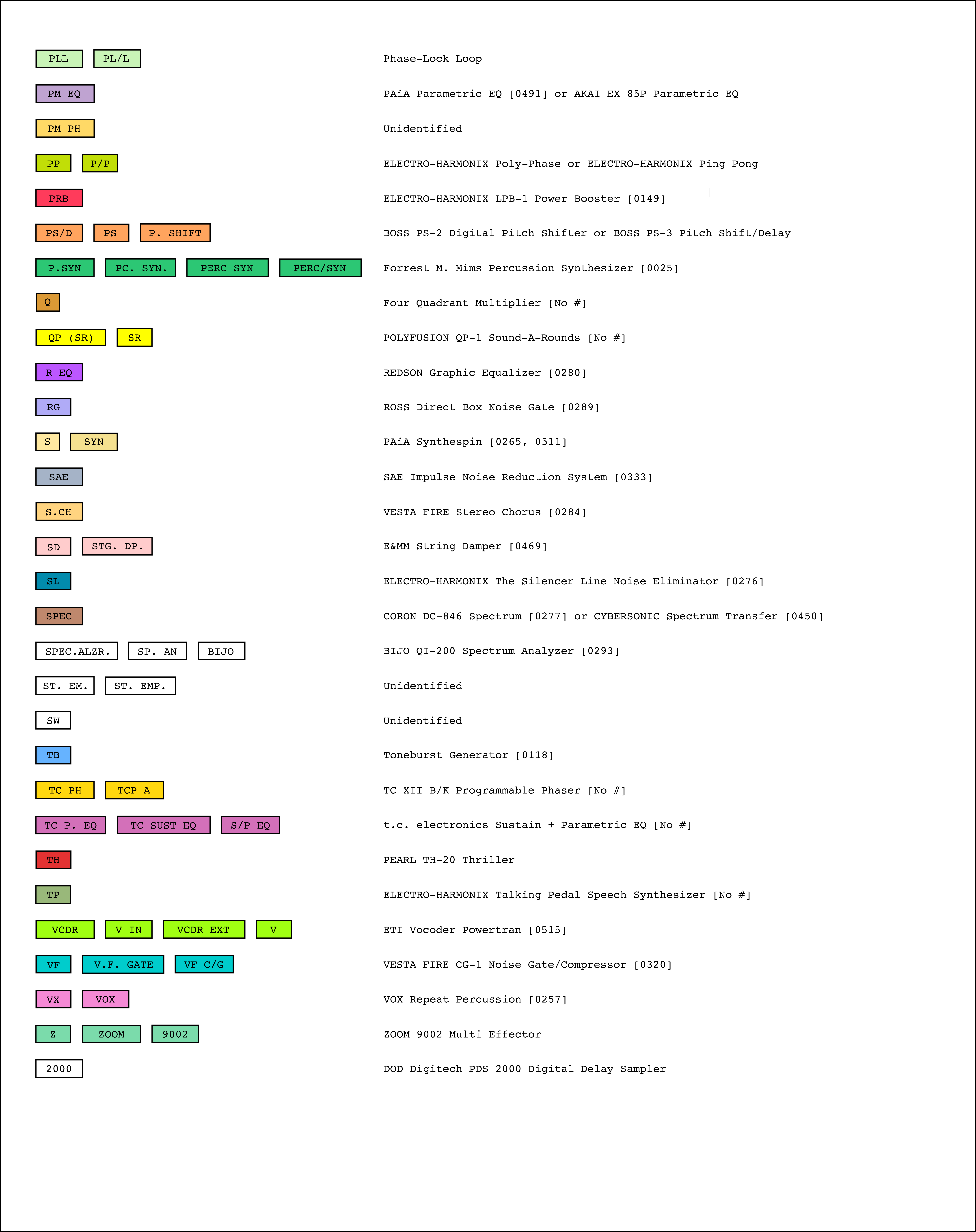 Legends write out the instrument names of Tudor's acronyms, followed by their archive number assigned by Matt Rogalsky.