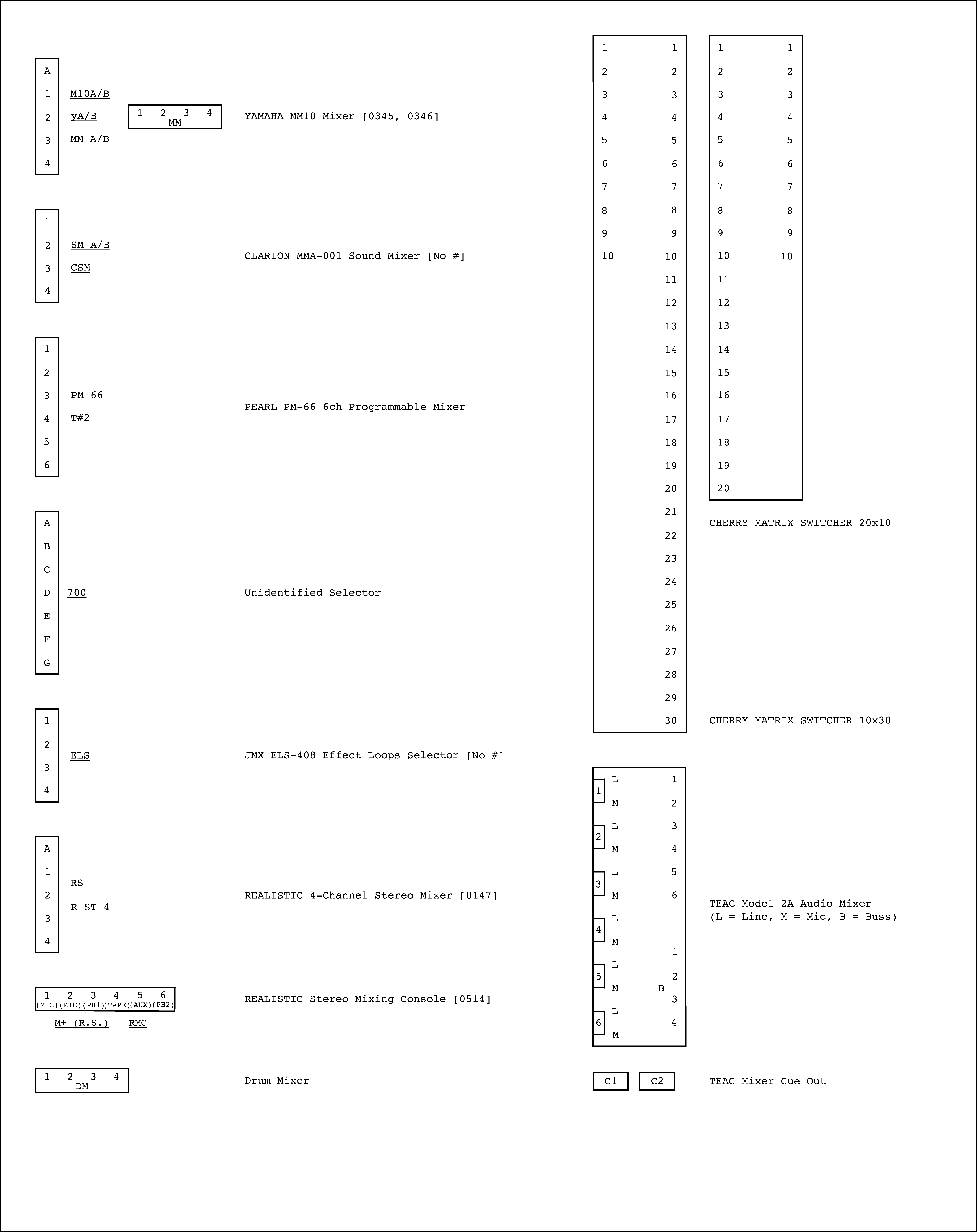 Re-drawings of Tudor's matrix maps (list of inputs and outputs to matrix switchers and mixers) in the form of connection diagrams