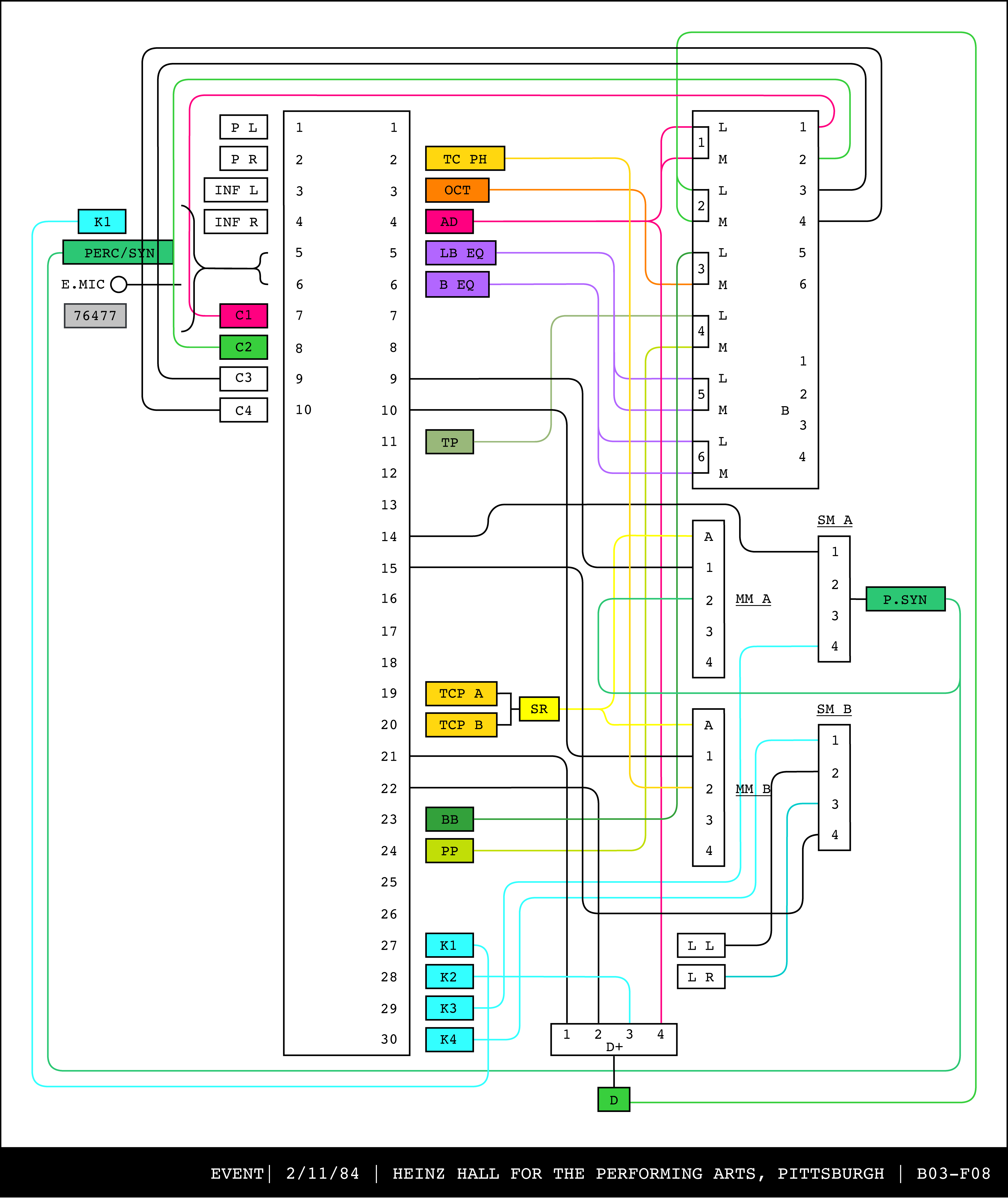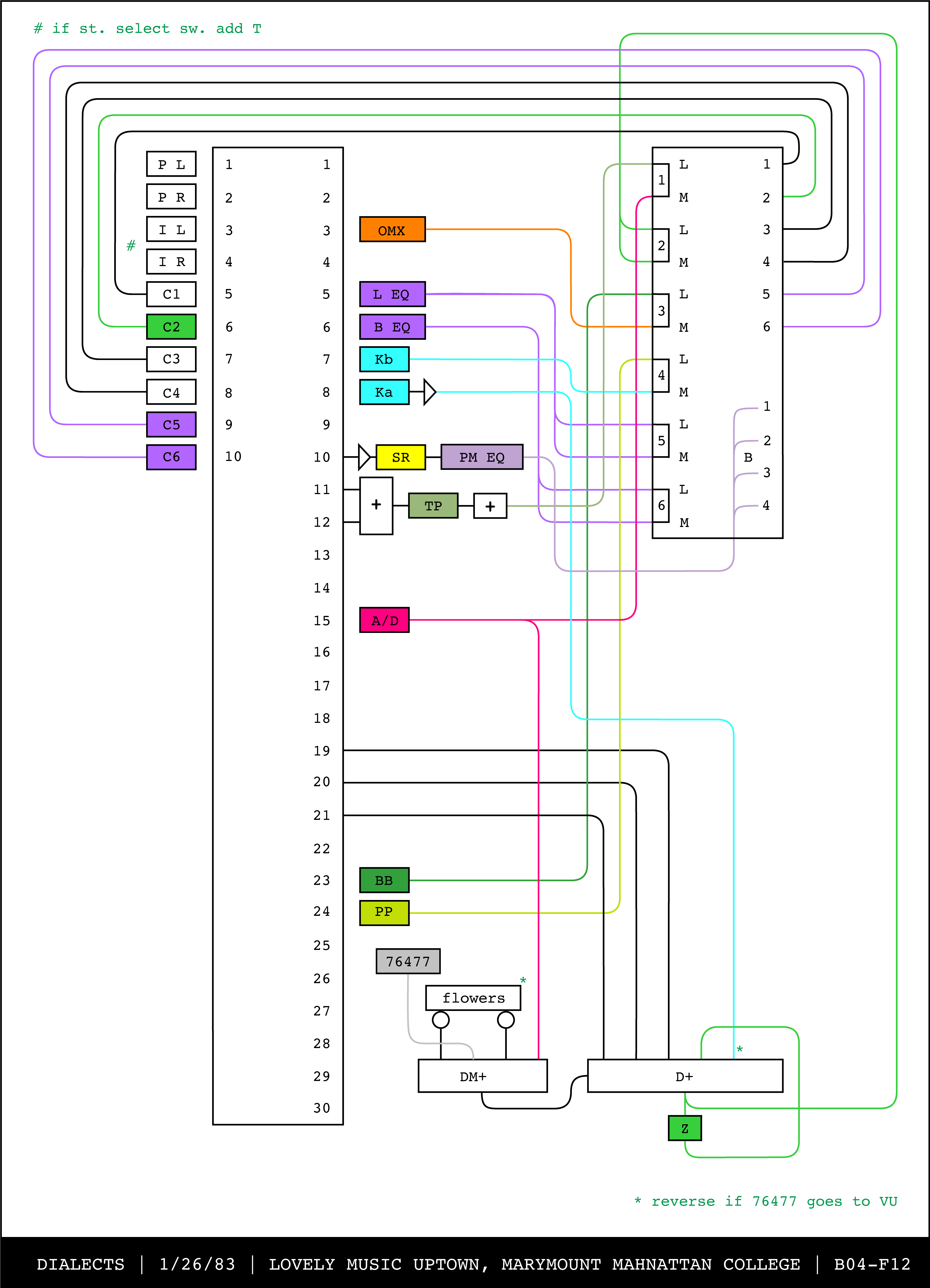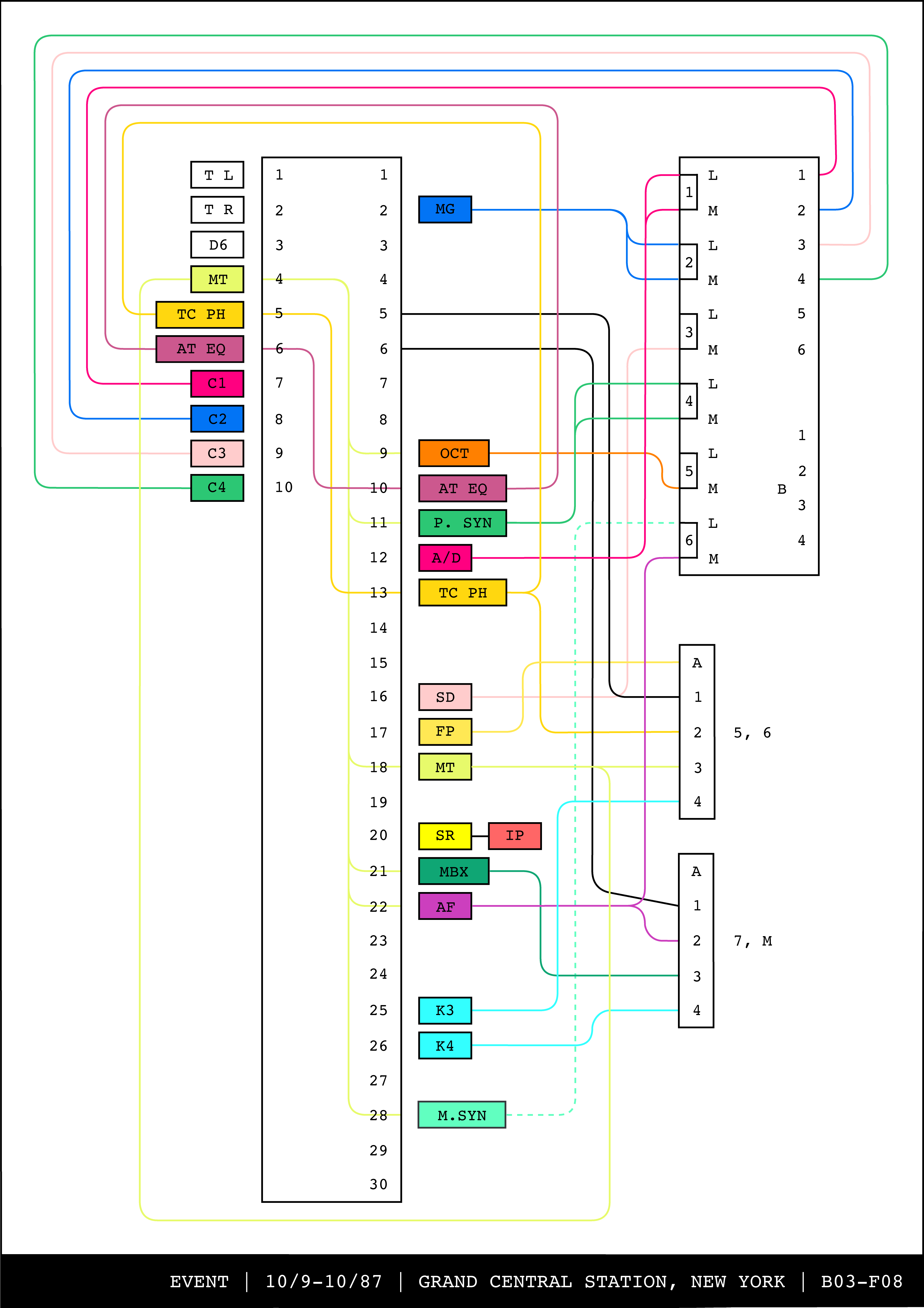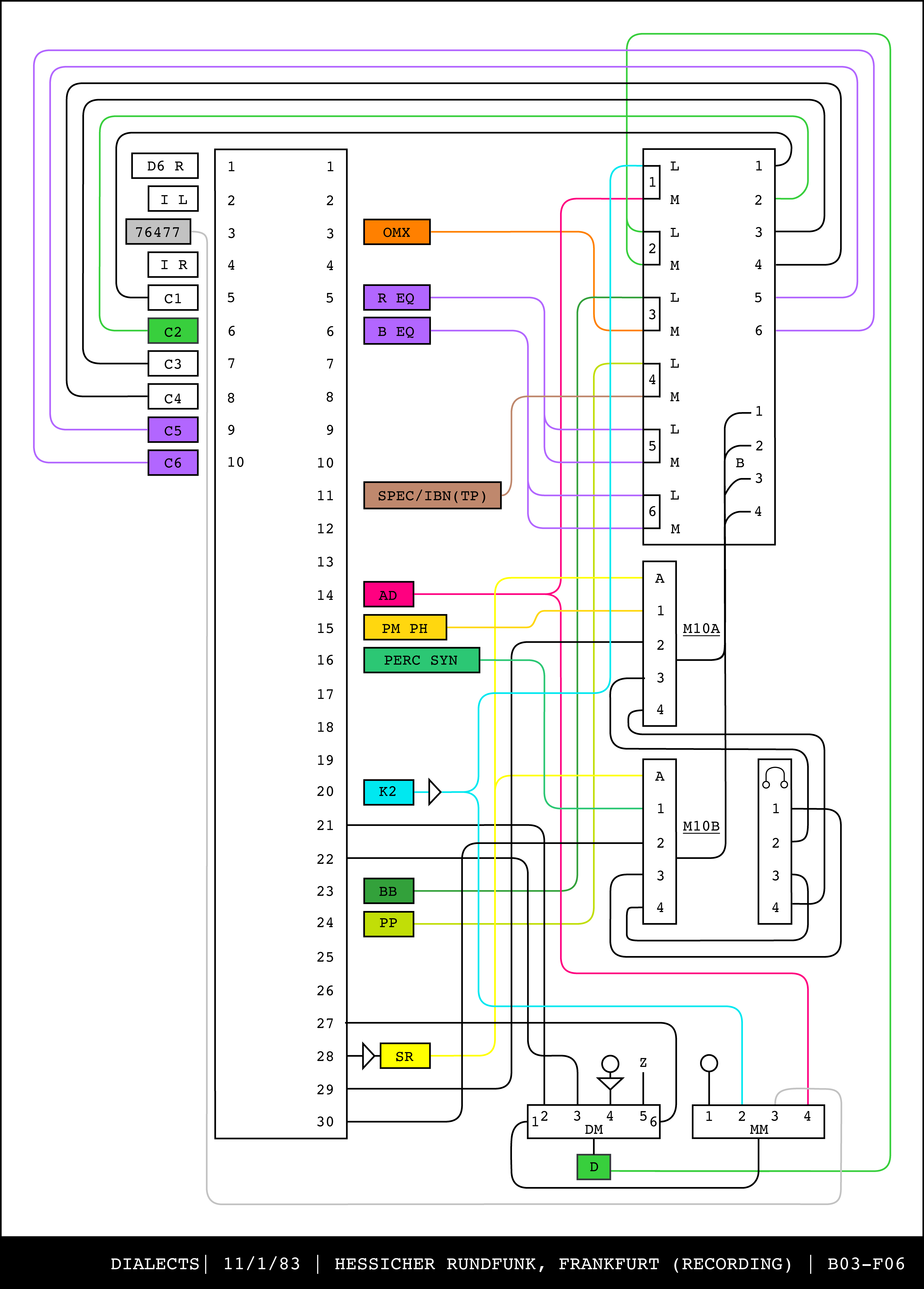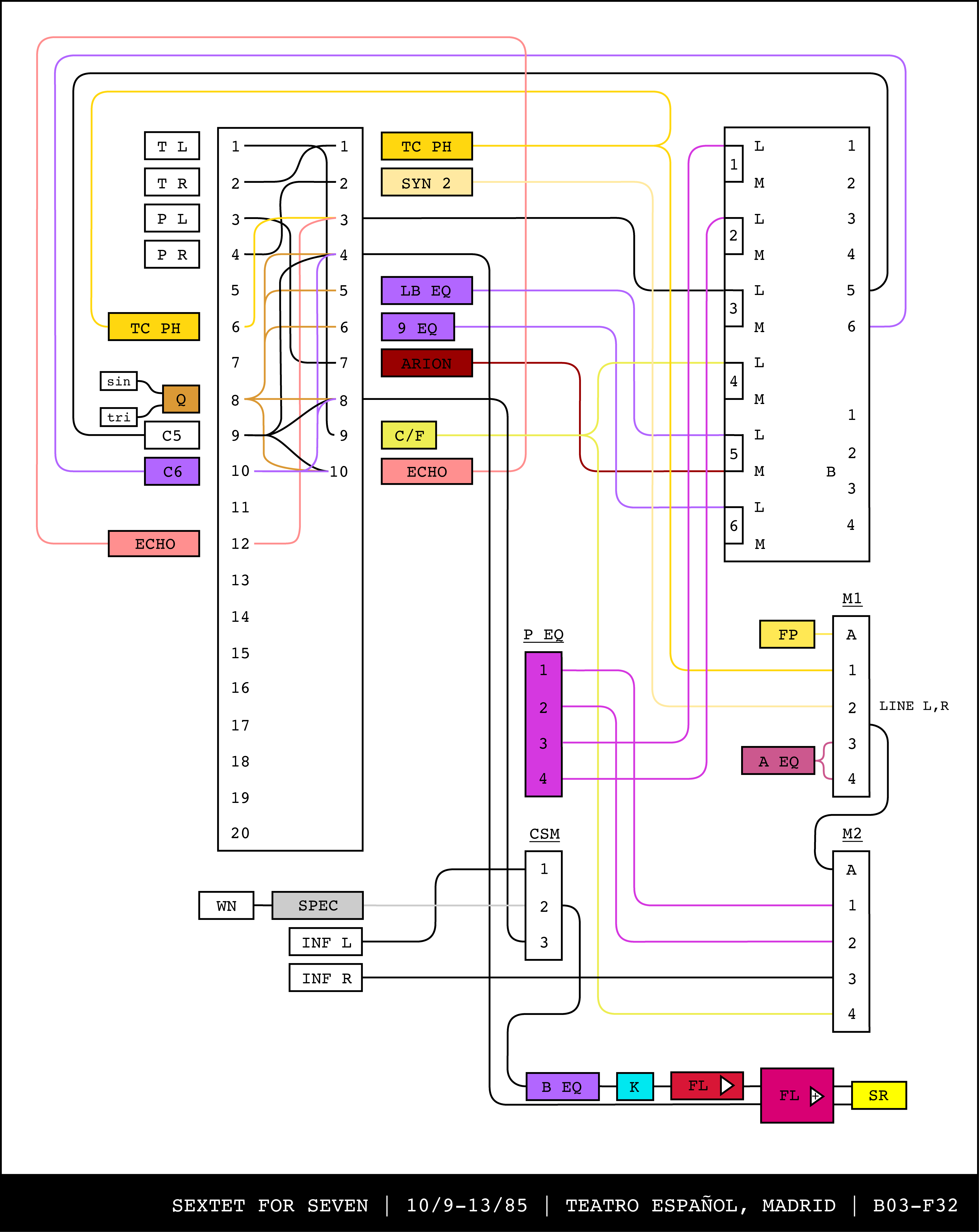 Re-drawing of Tudor's matrix maps (list of inputs and outputs to matrix switchers and mixers) in the form of connection diagrams (limited to maps with specific dates).