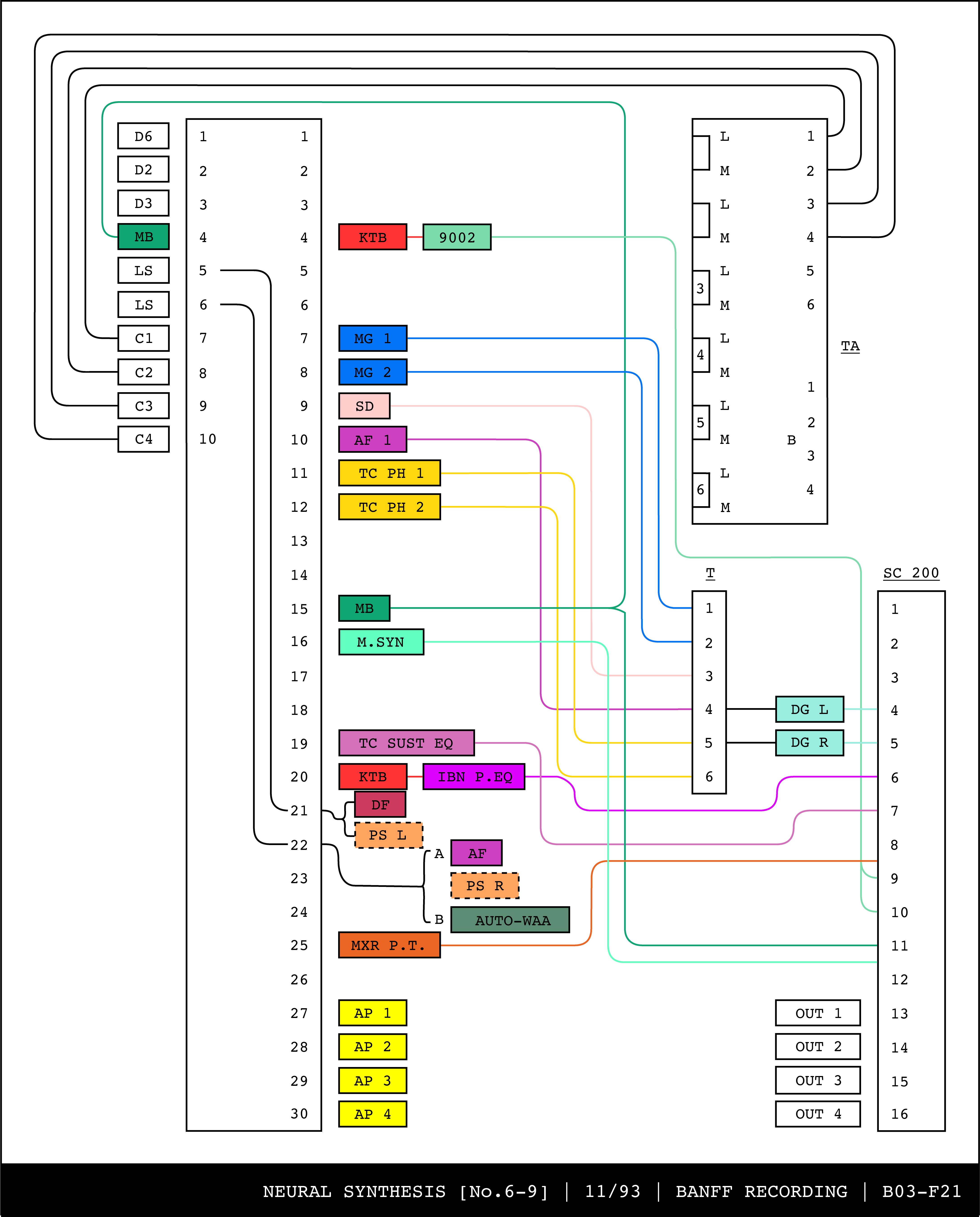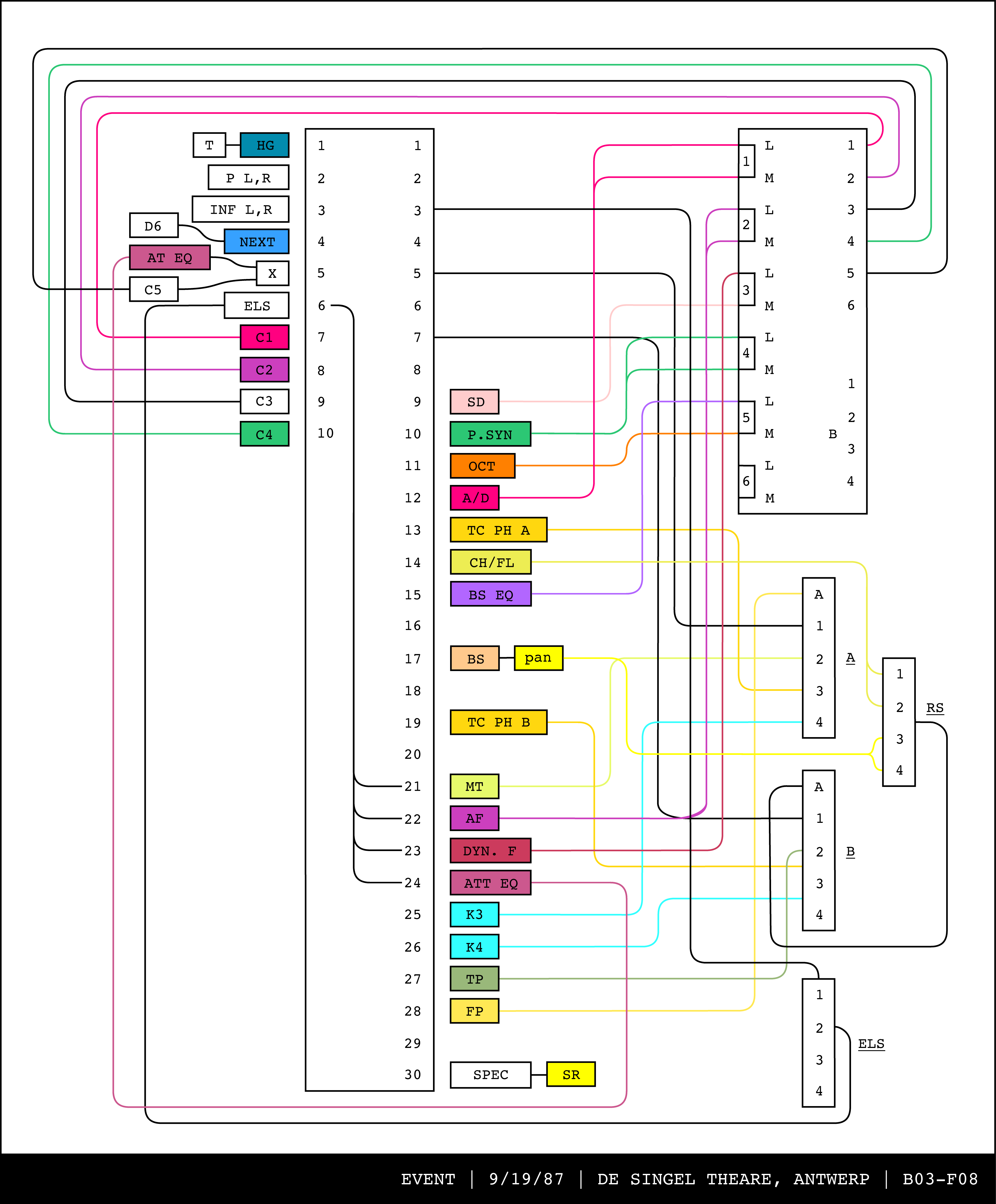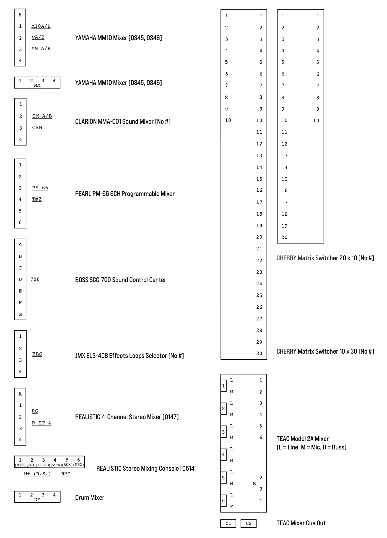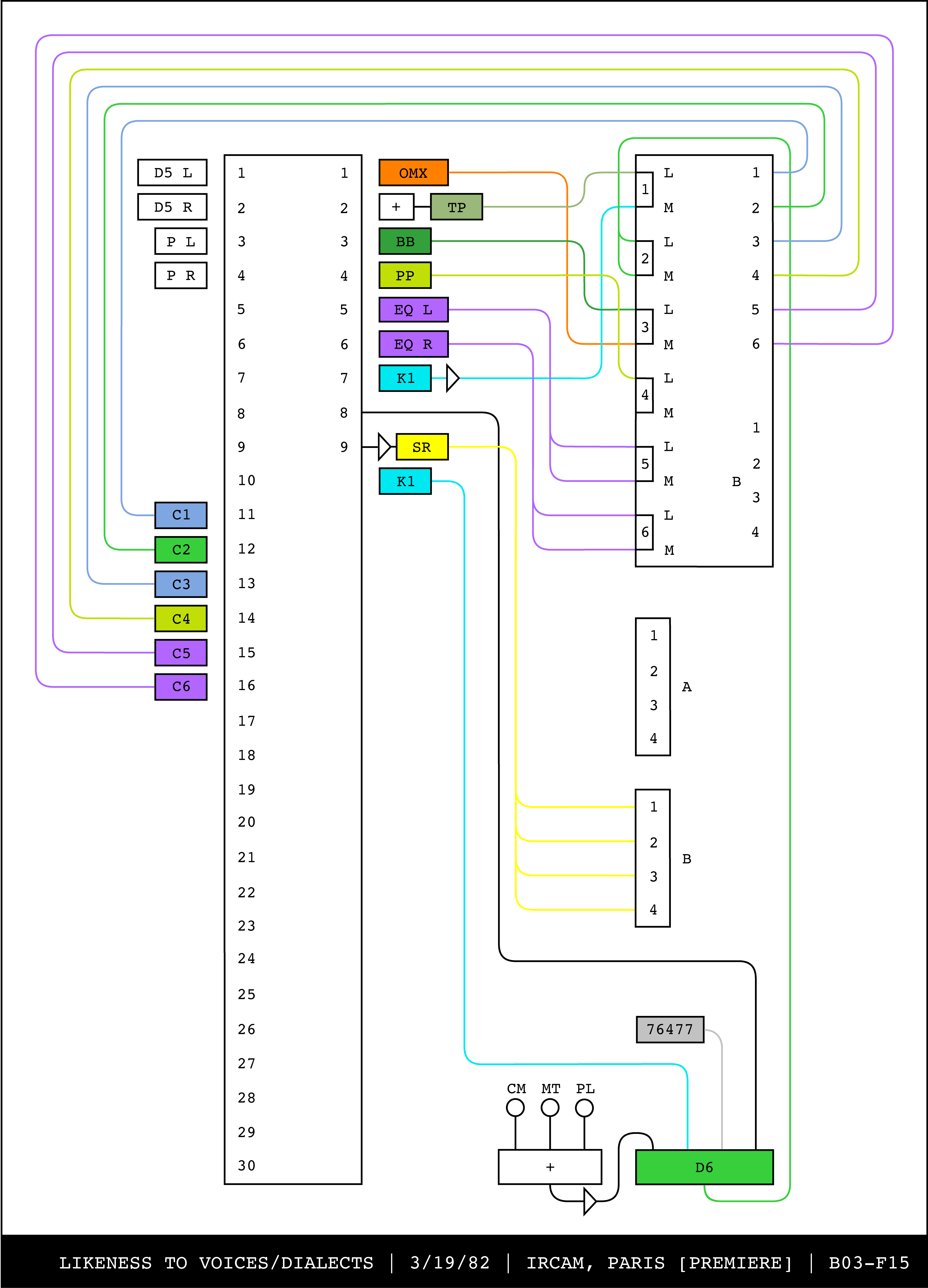 Re-drawing of Tudor's matrix maps (list of inputs and outputs to matrix switchers and mixers) in the form of connection diagrams (limited to maps with specific dates).