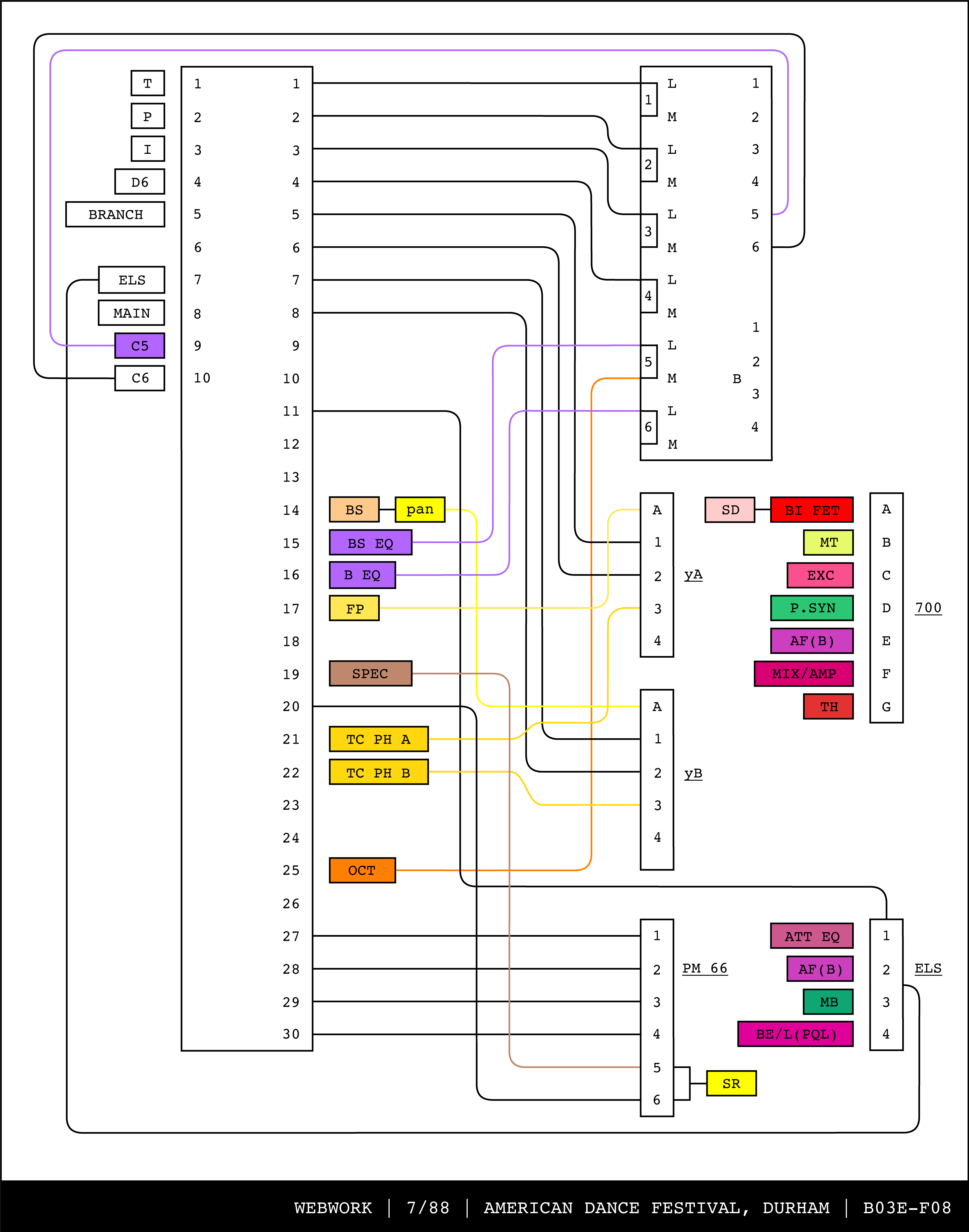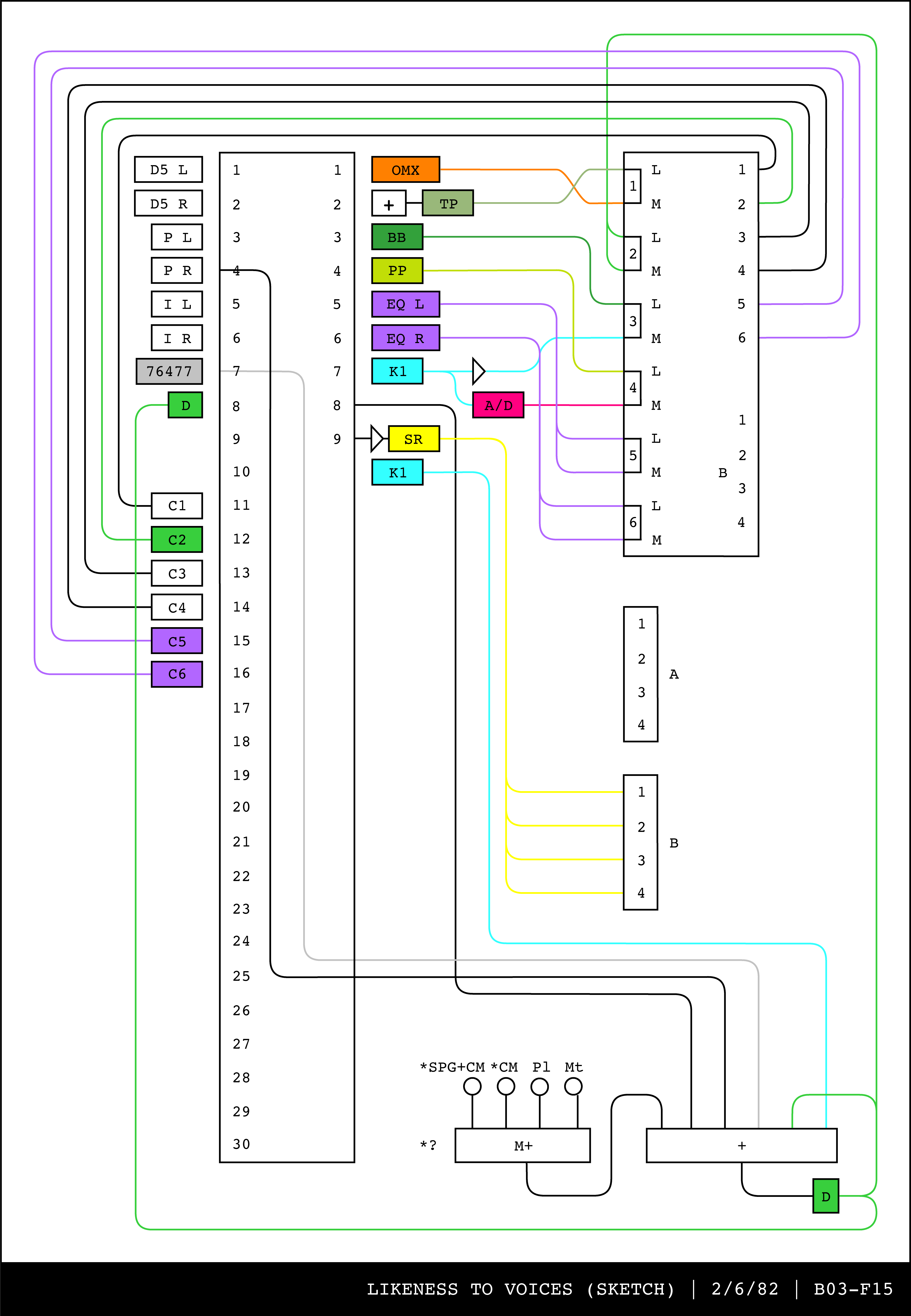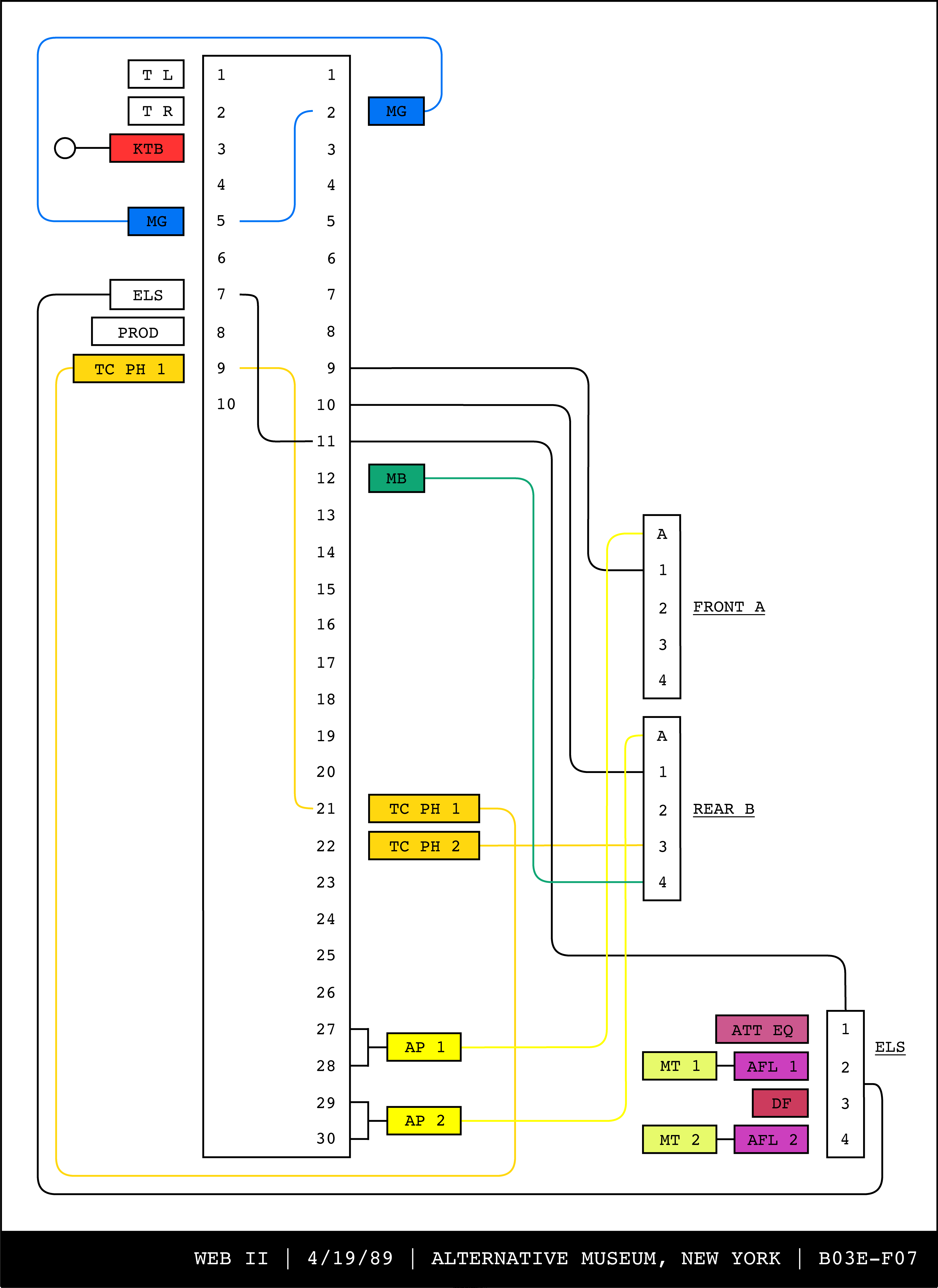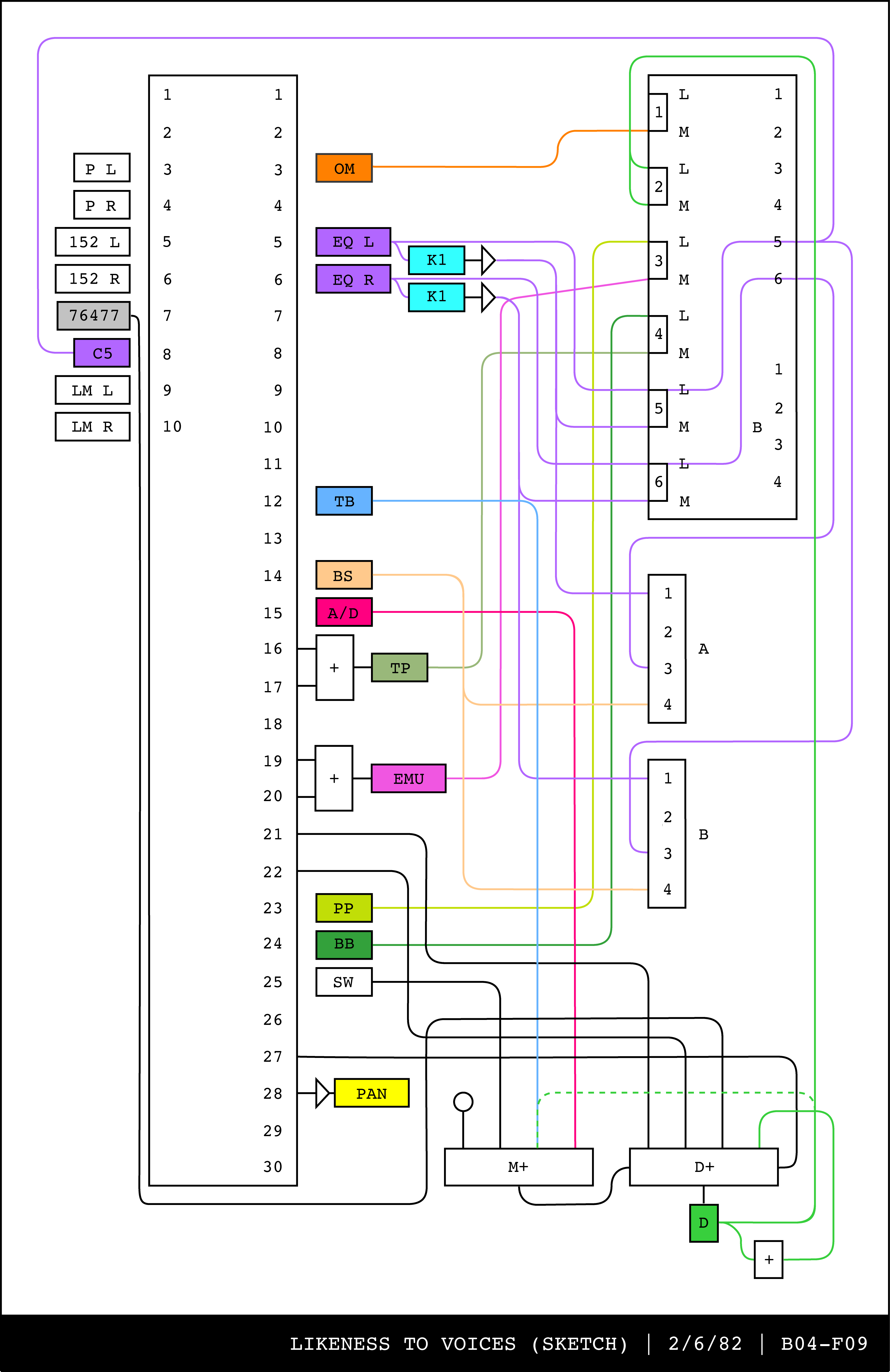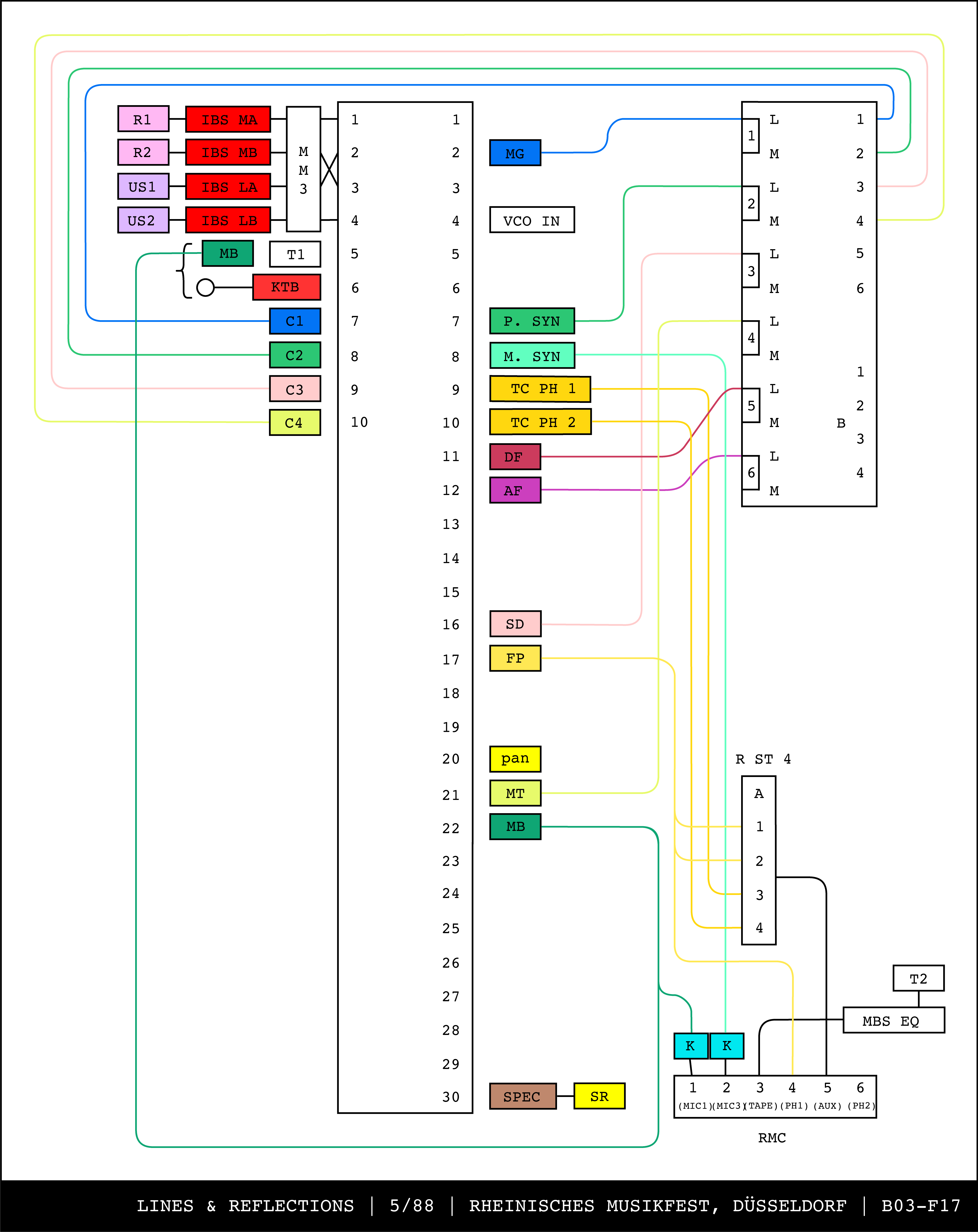 Re-drawing of Tudor's matrix maps (list of inputs and outputs to matrix switchers and mixers) in the form of connection diagrams (limited to maps with specific dates).