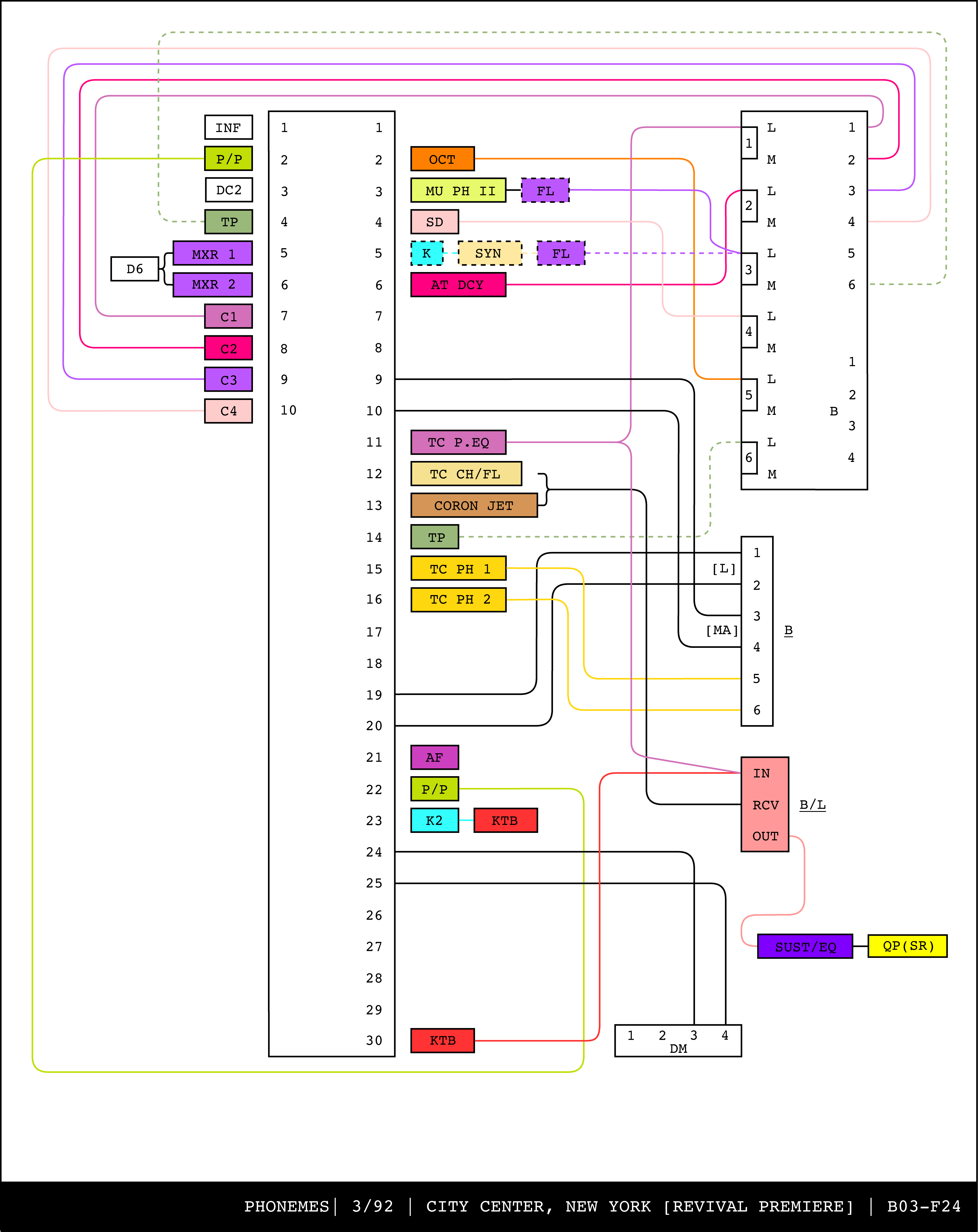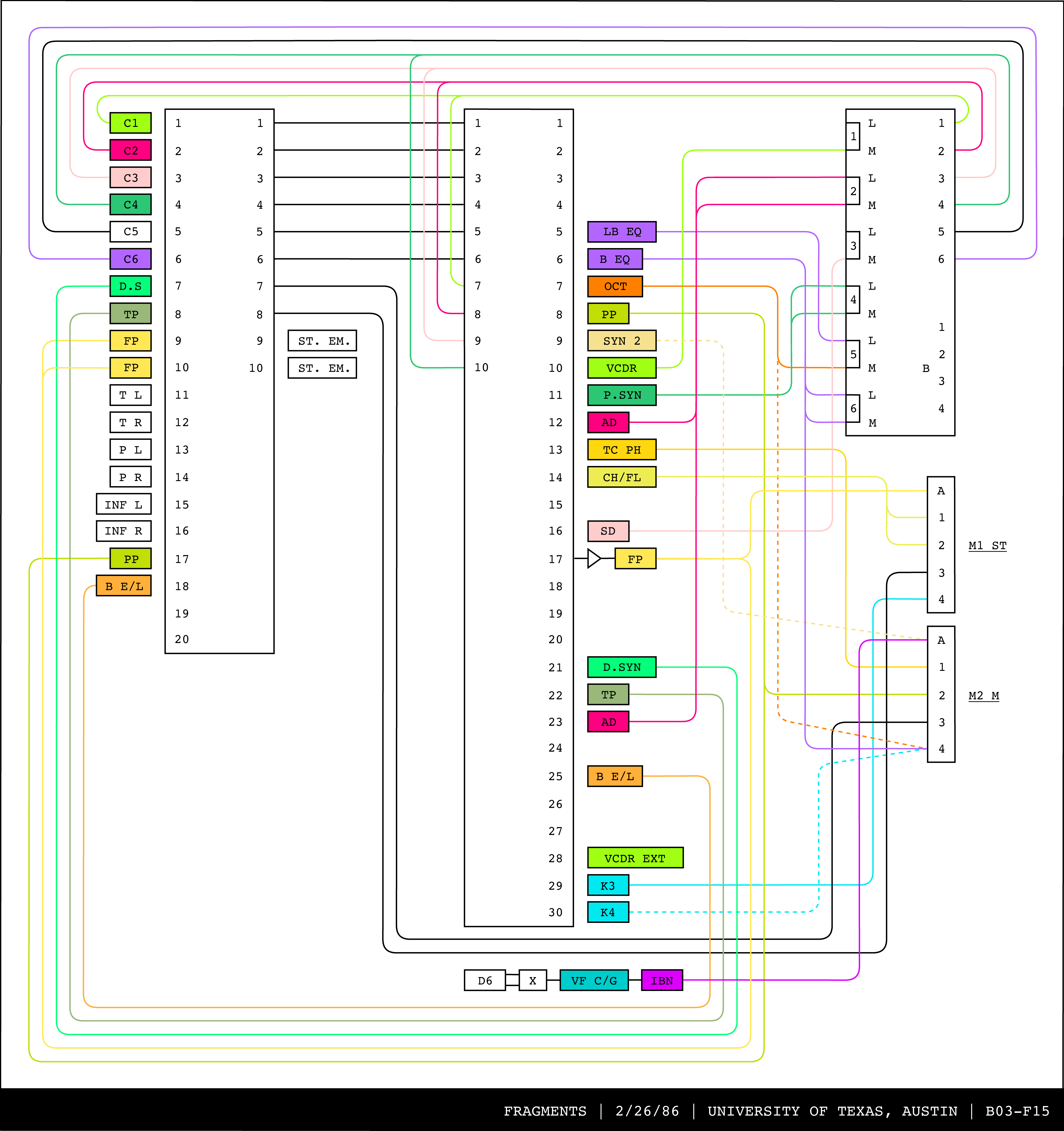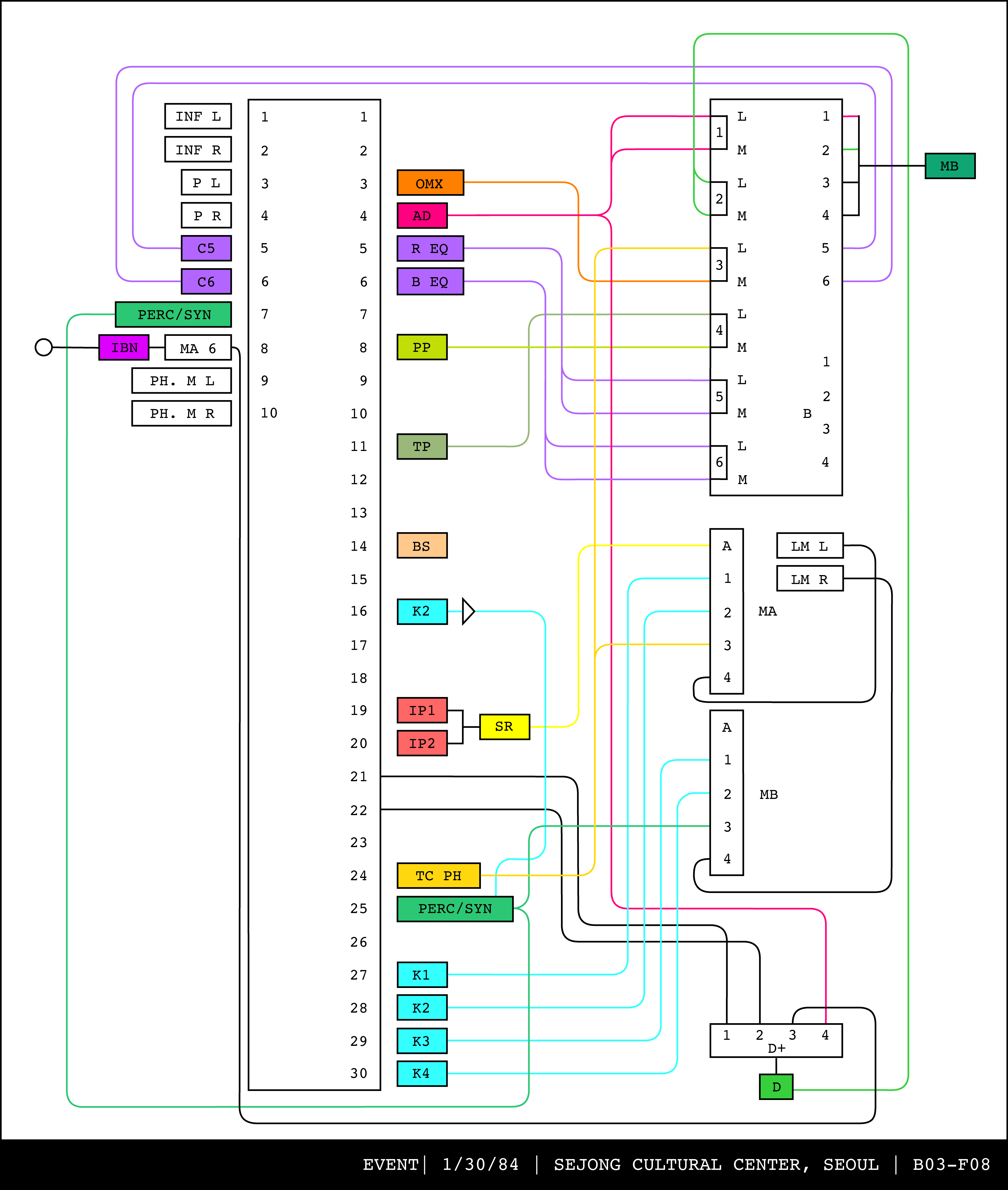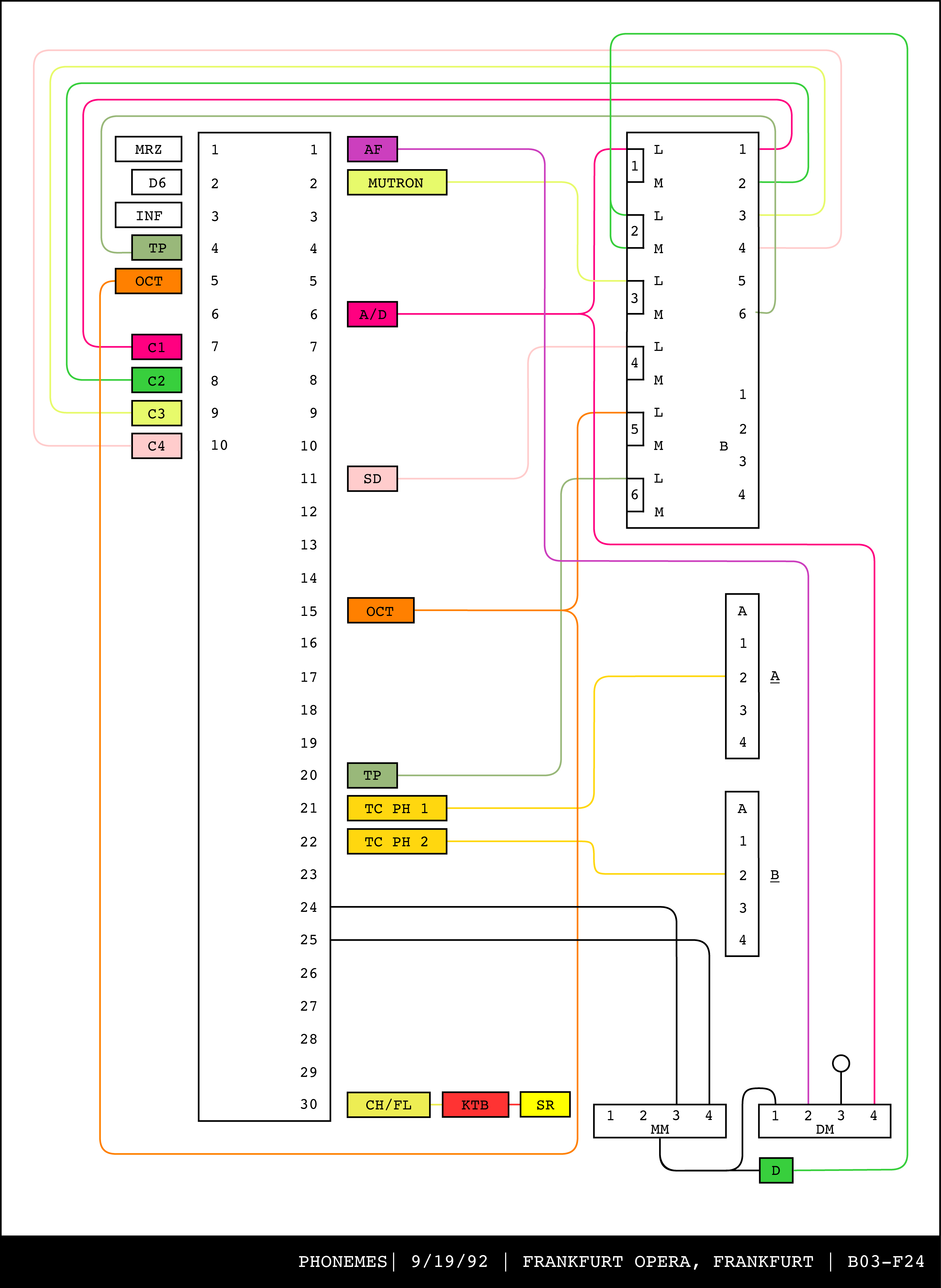 Re-drawing of Tudor's matrix maps (list of inputs and outputs to matrix switchers and mixers) in the form of connection diagrams (limited to maps with specific dates).