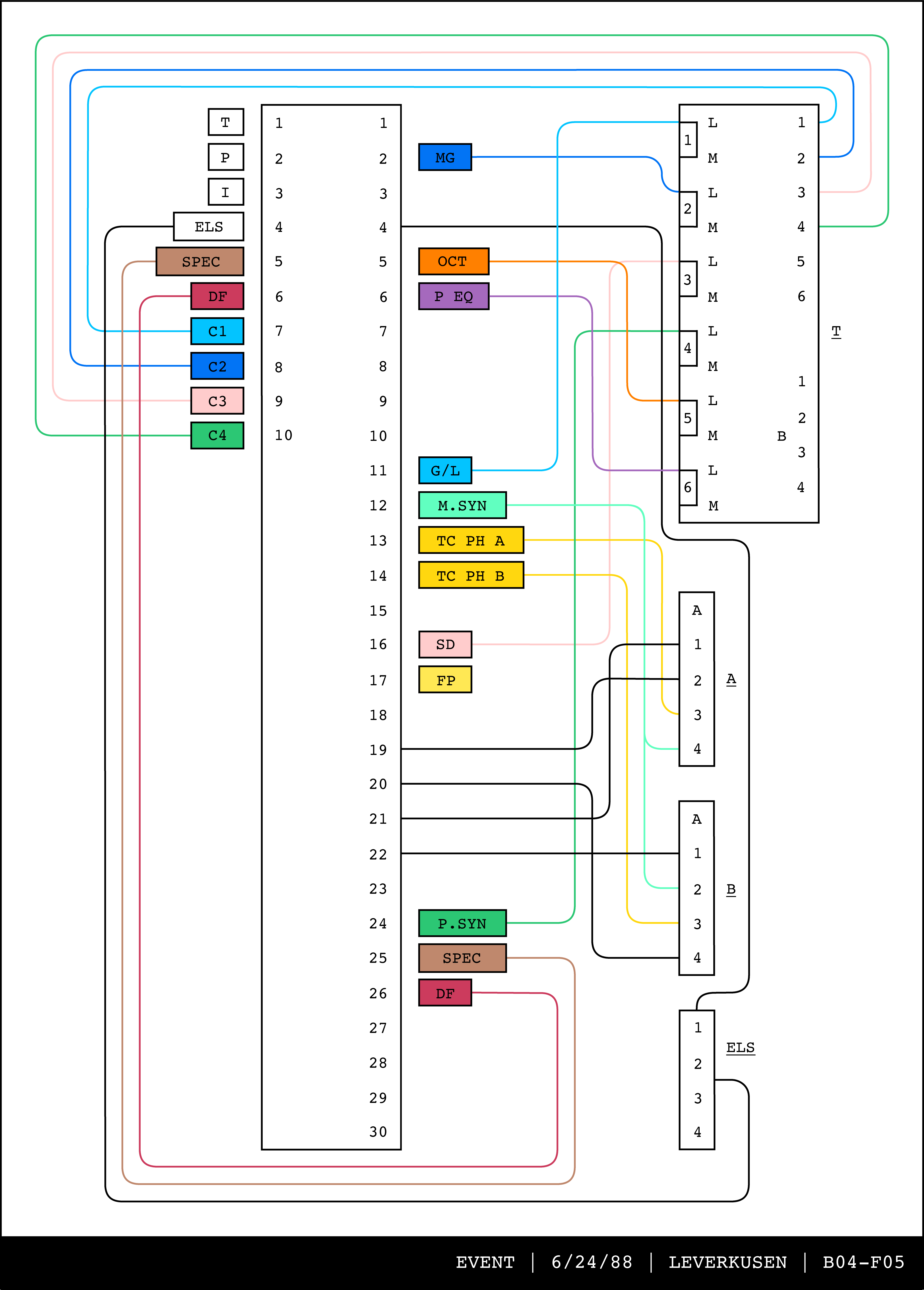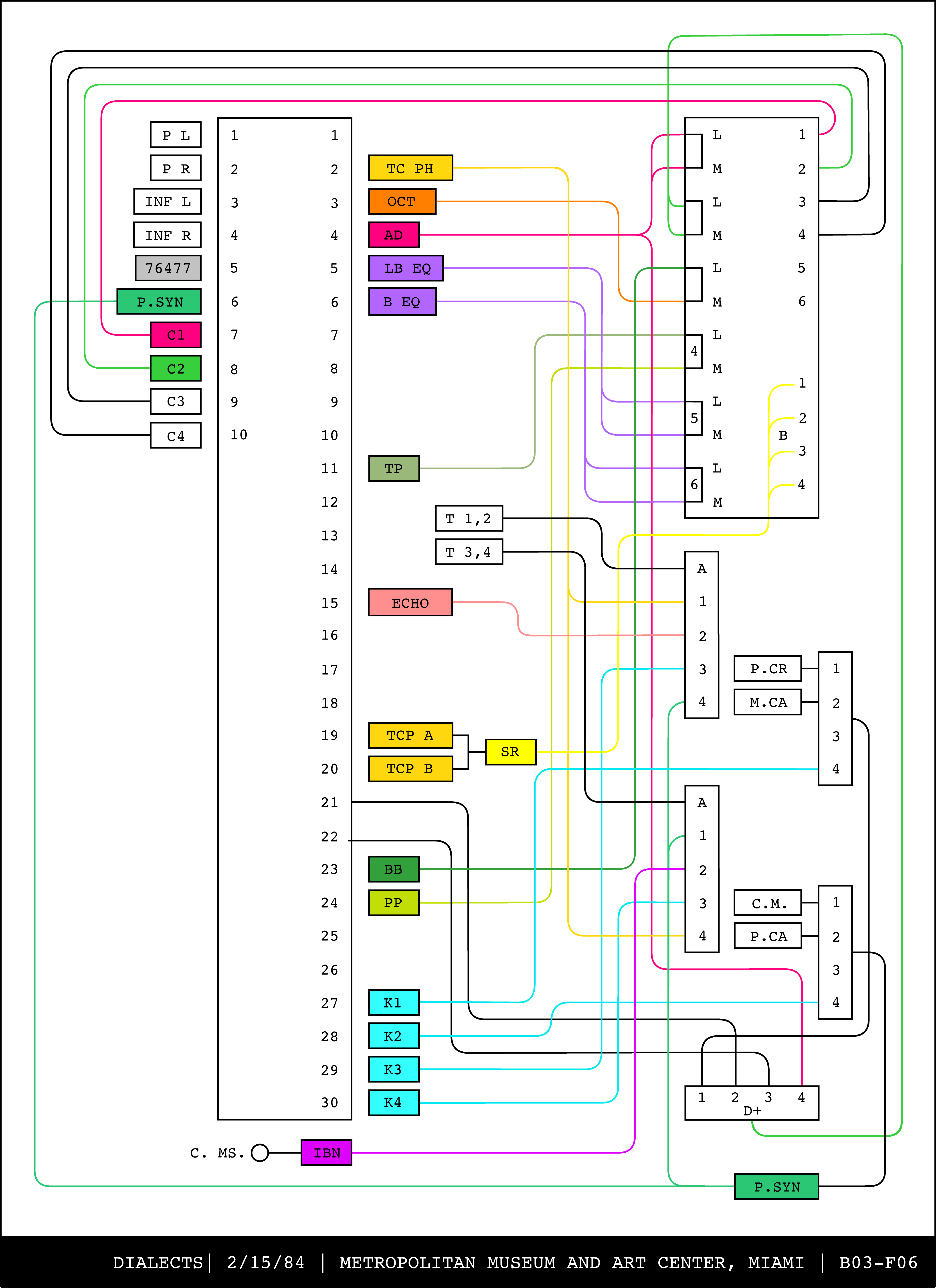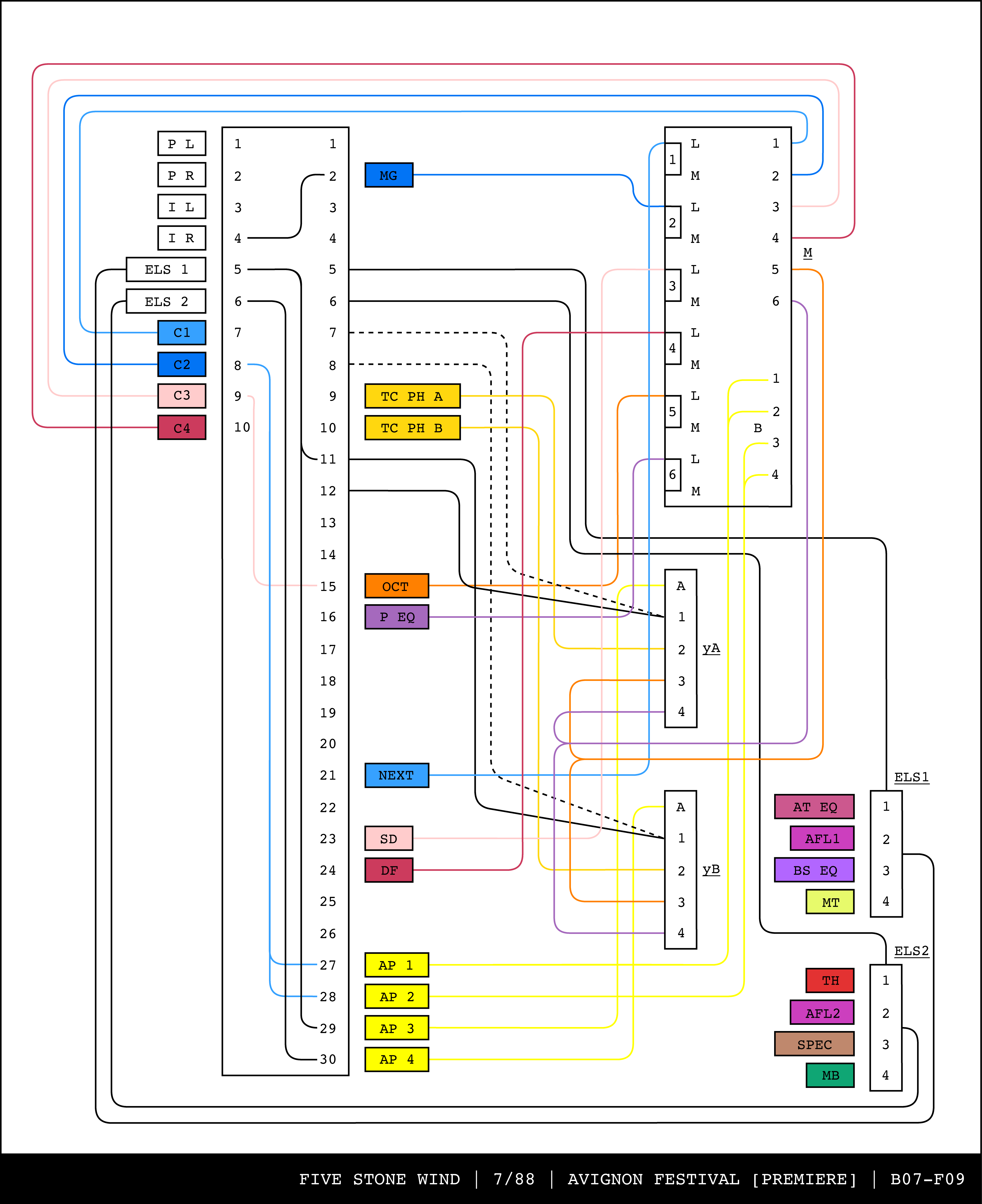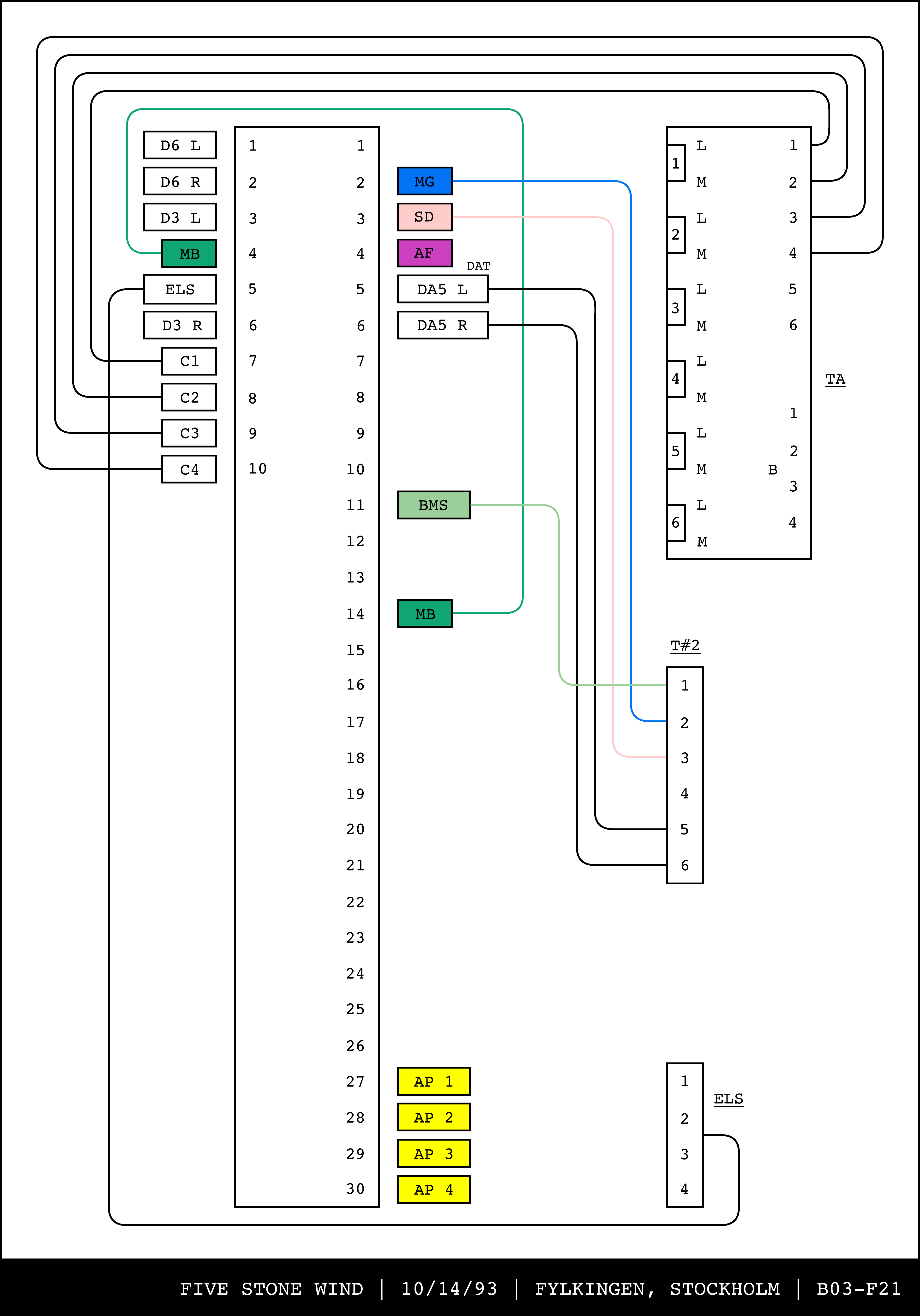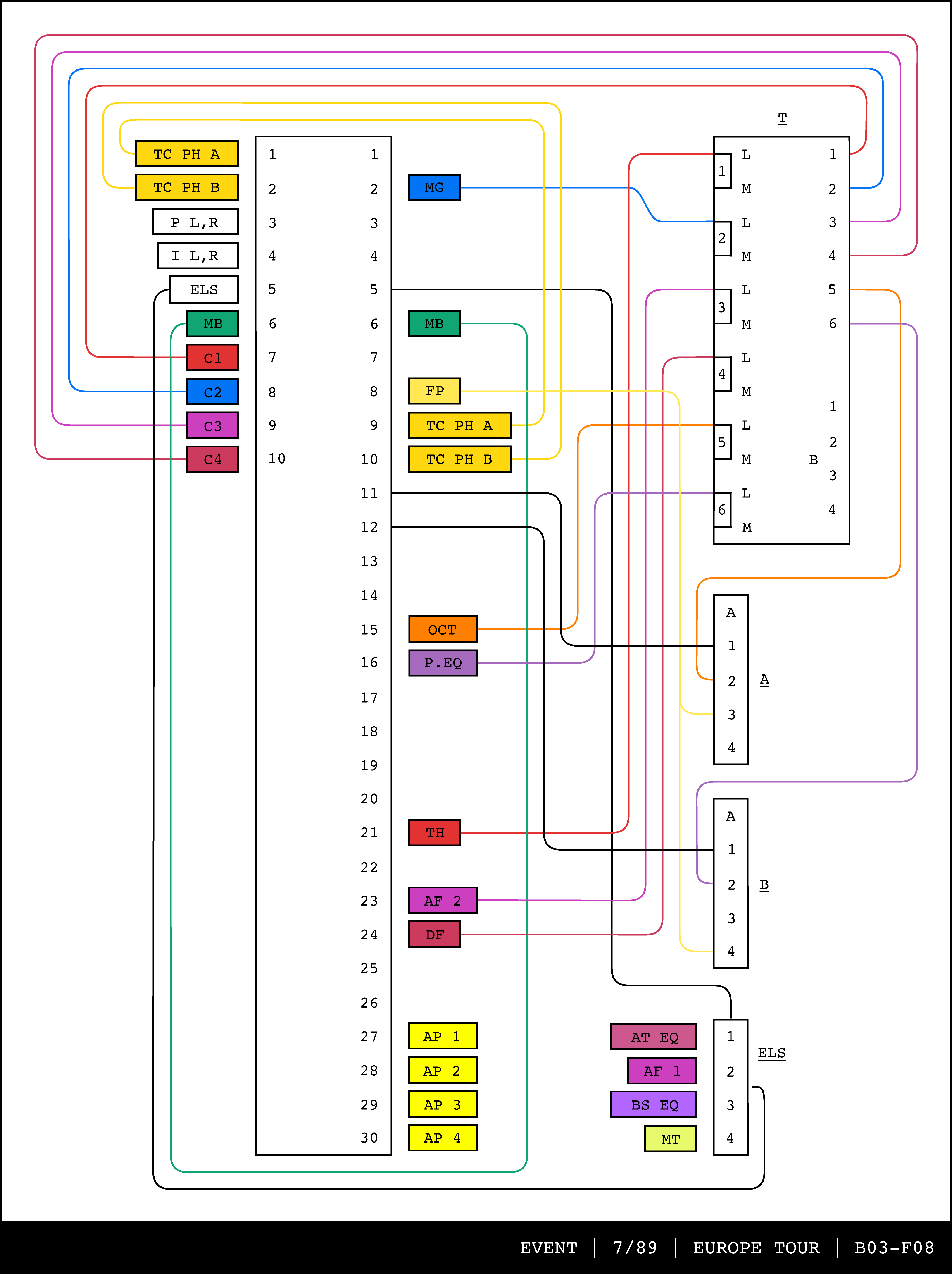 Re-drawing of Tudor's matrix maps (list of inputs and outputs to matrix switchers and mixers) in the form of connection diagrams (limited to maps with specific dates).