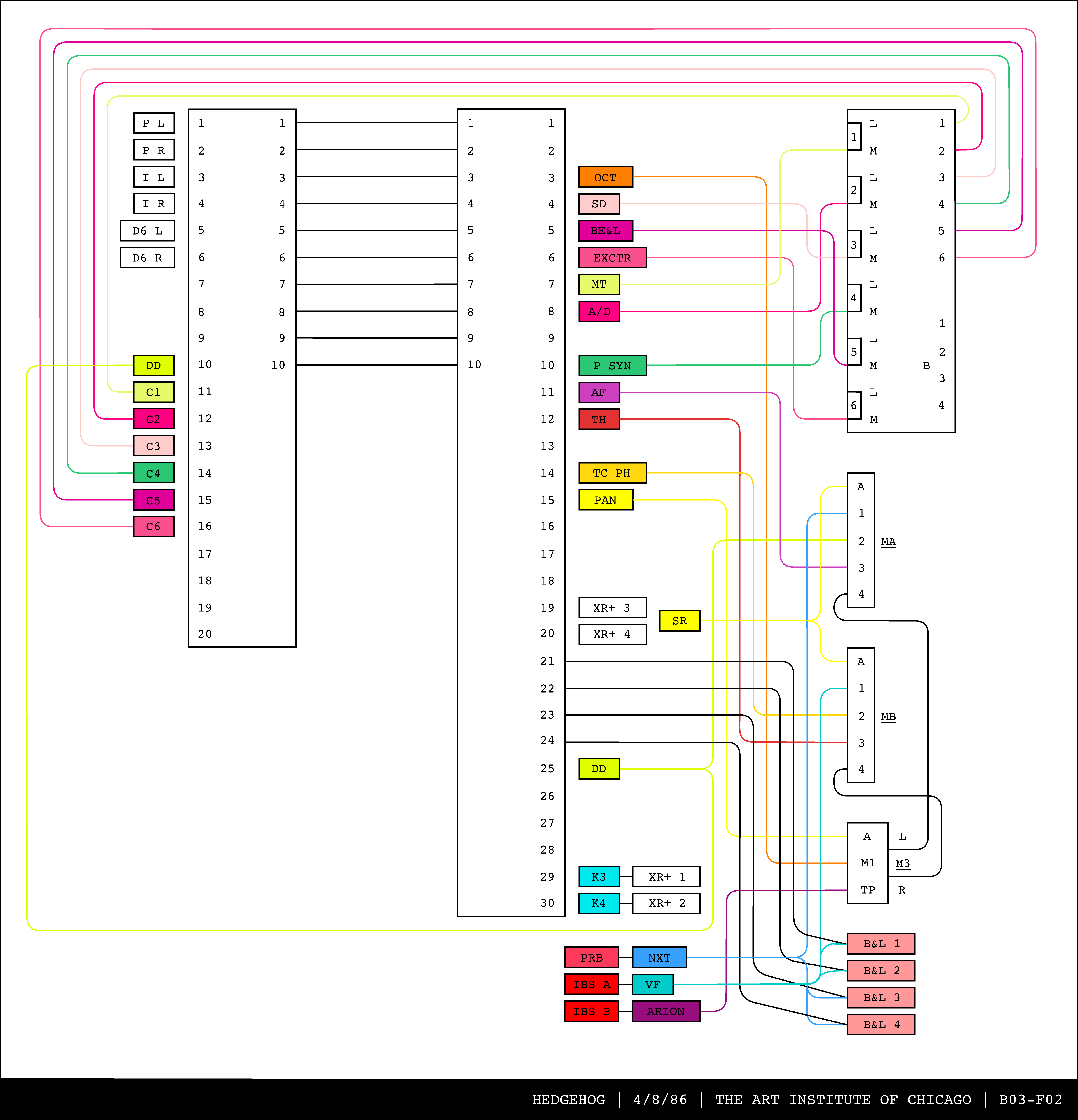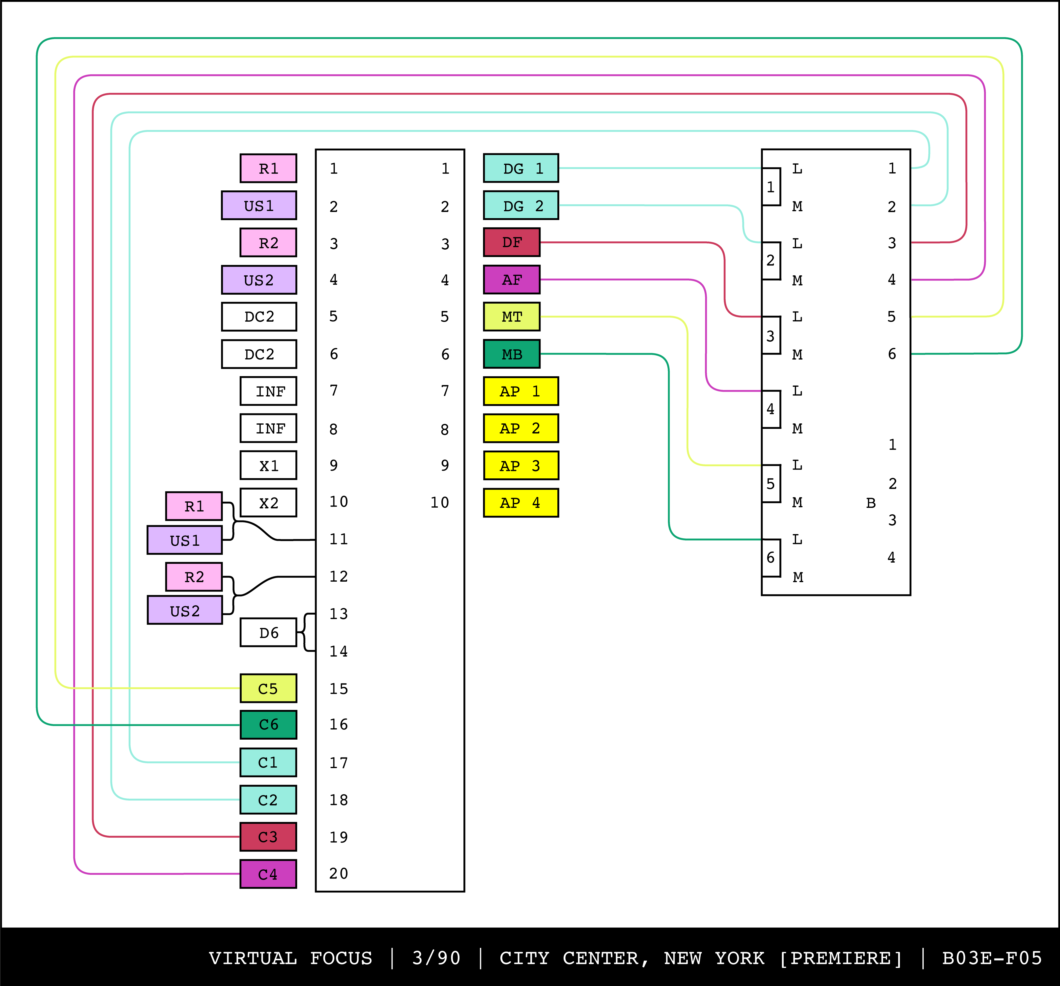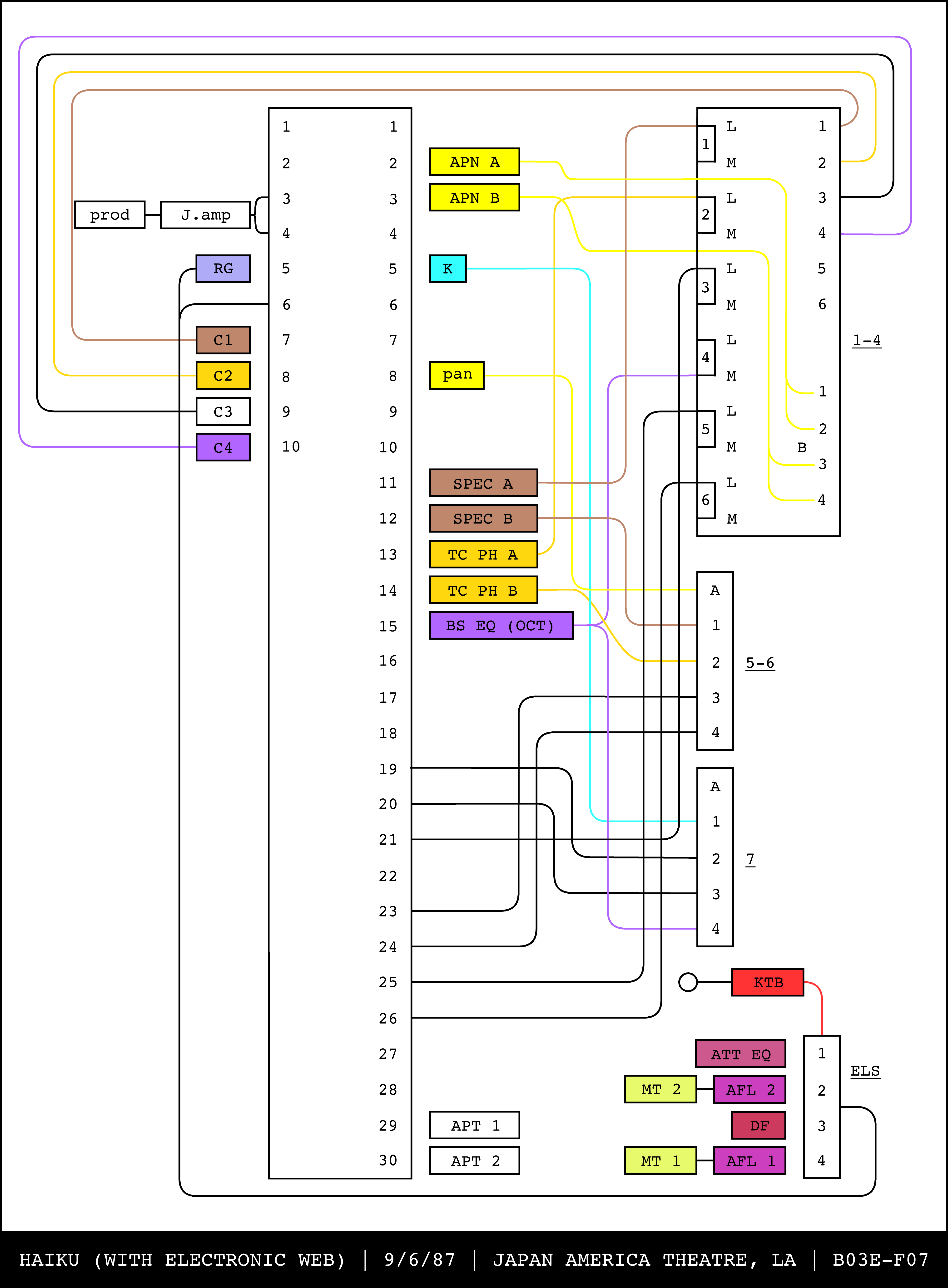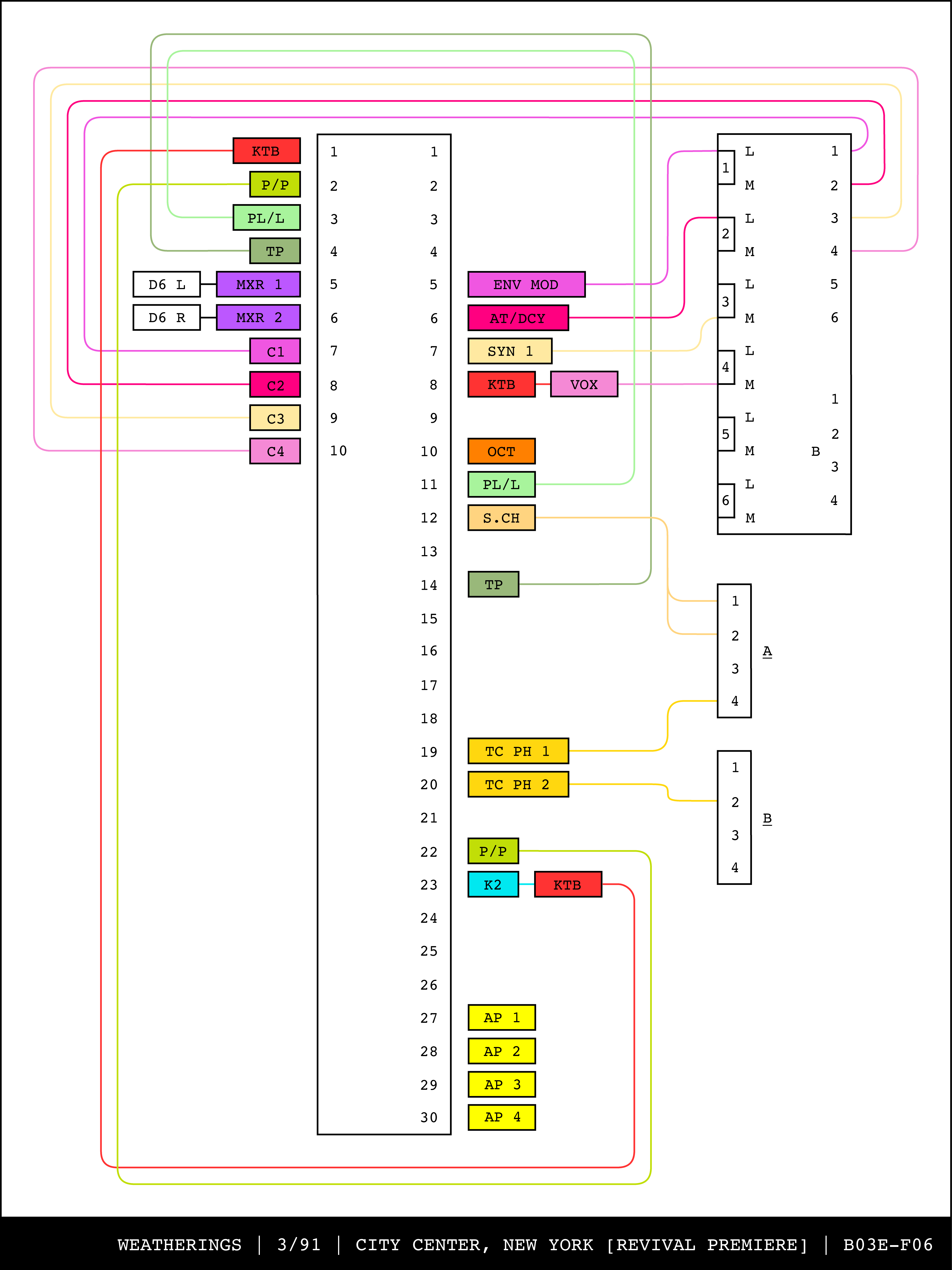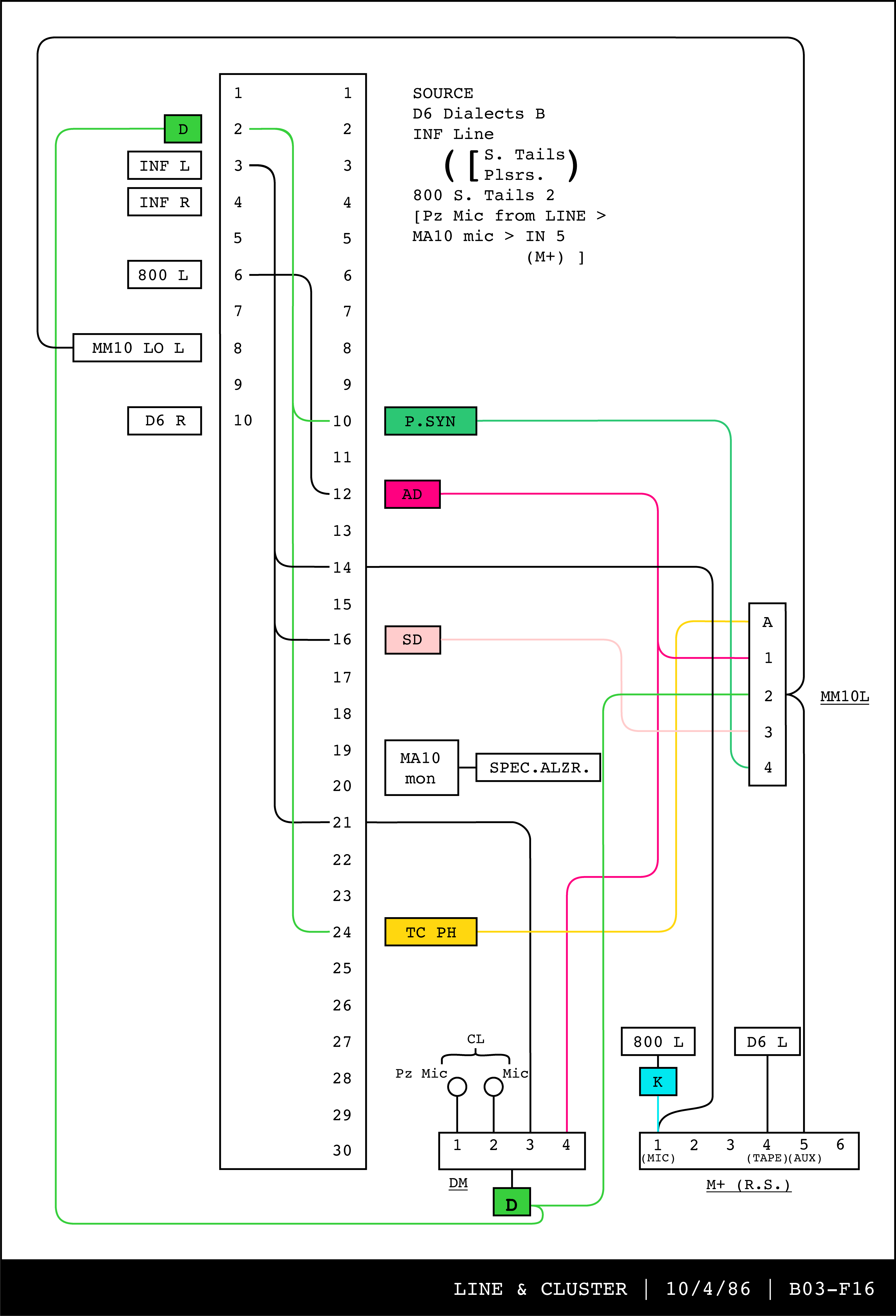 Re-drawing of Tudor's matrix maps (list of inputs and outputs to matrix switchers and mixers) in the form of connection diagrams (limited to maps with specific dates).