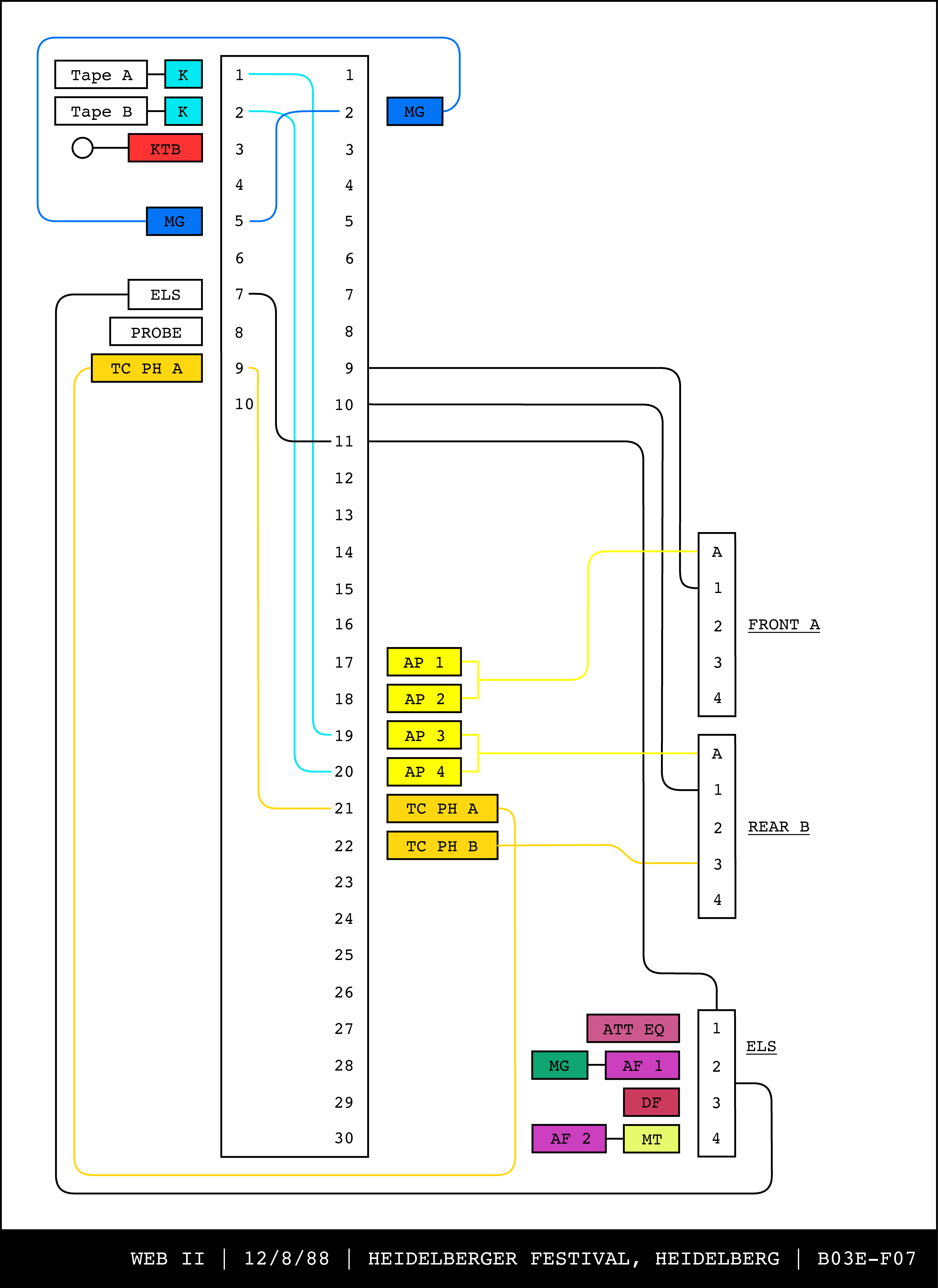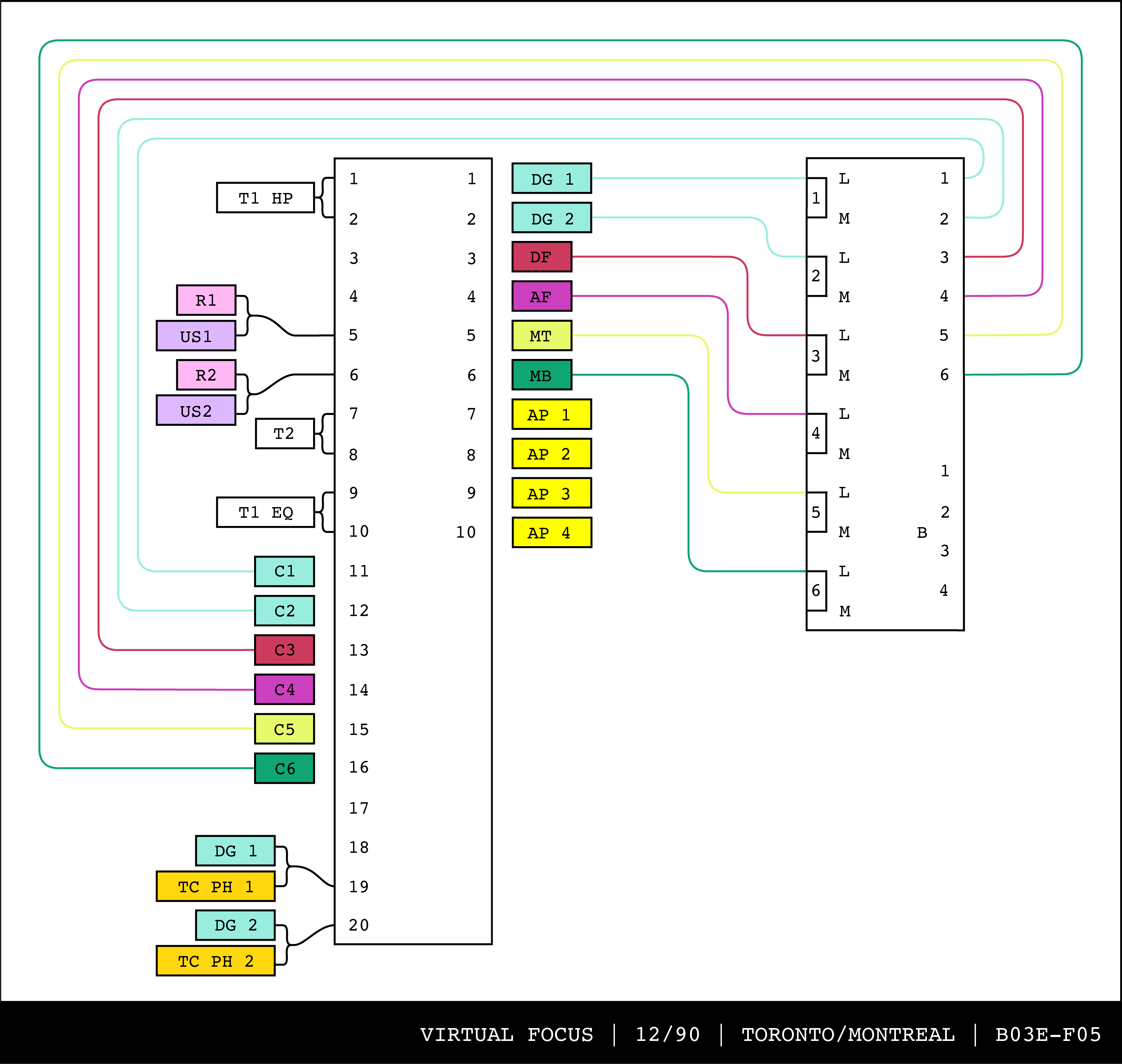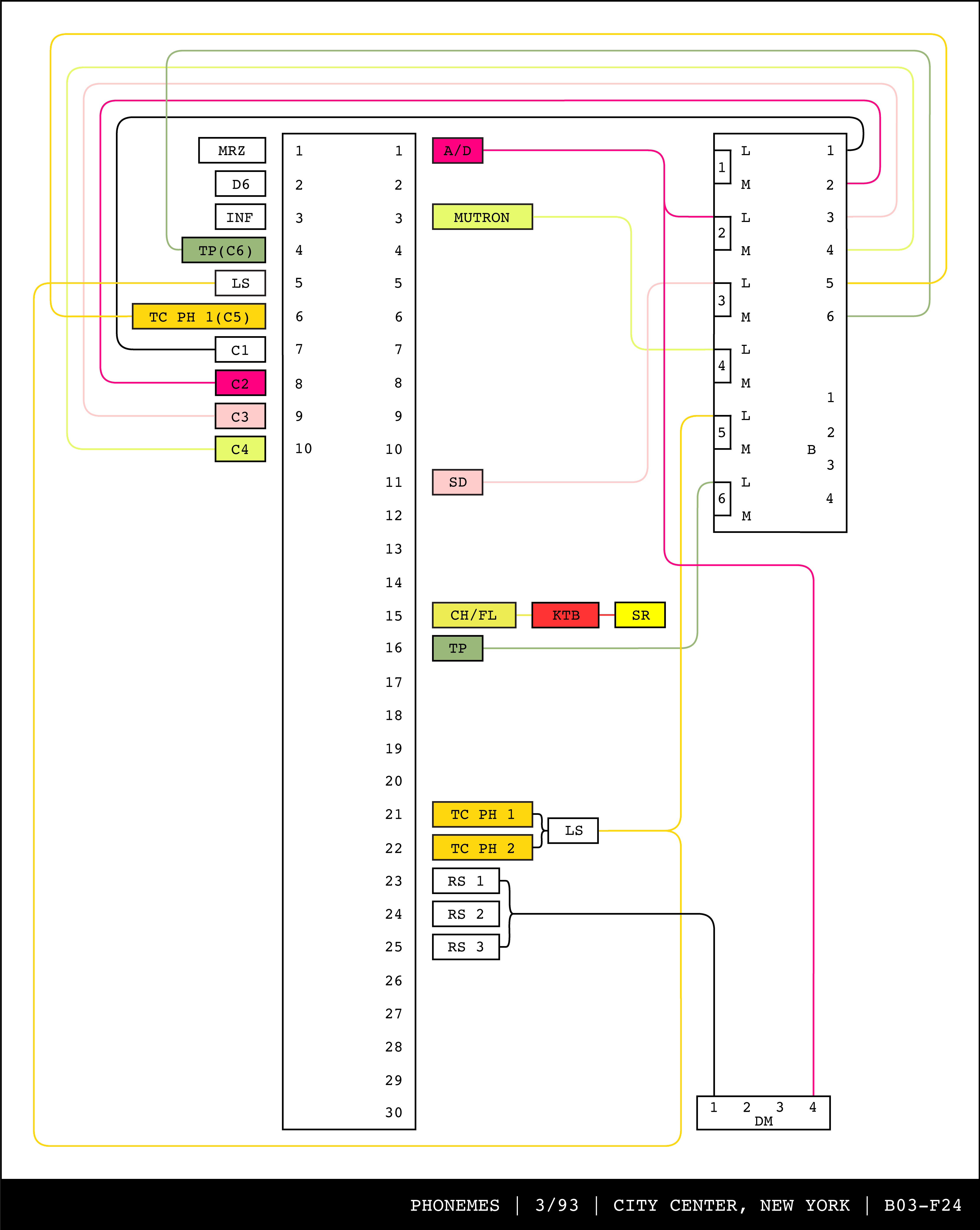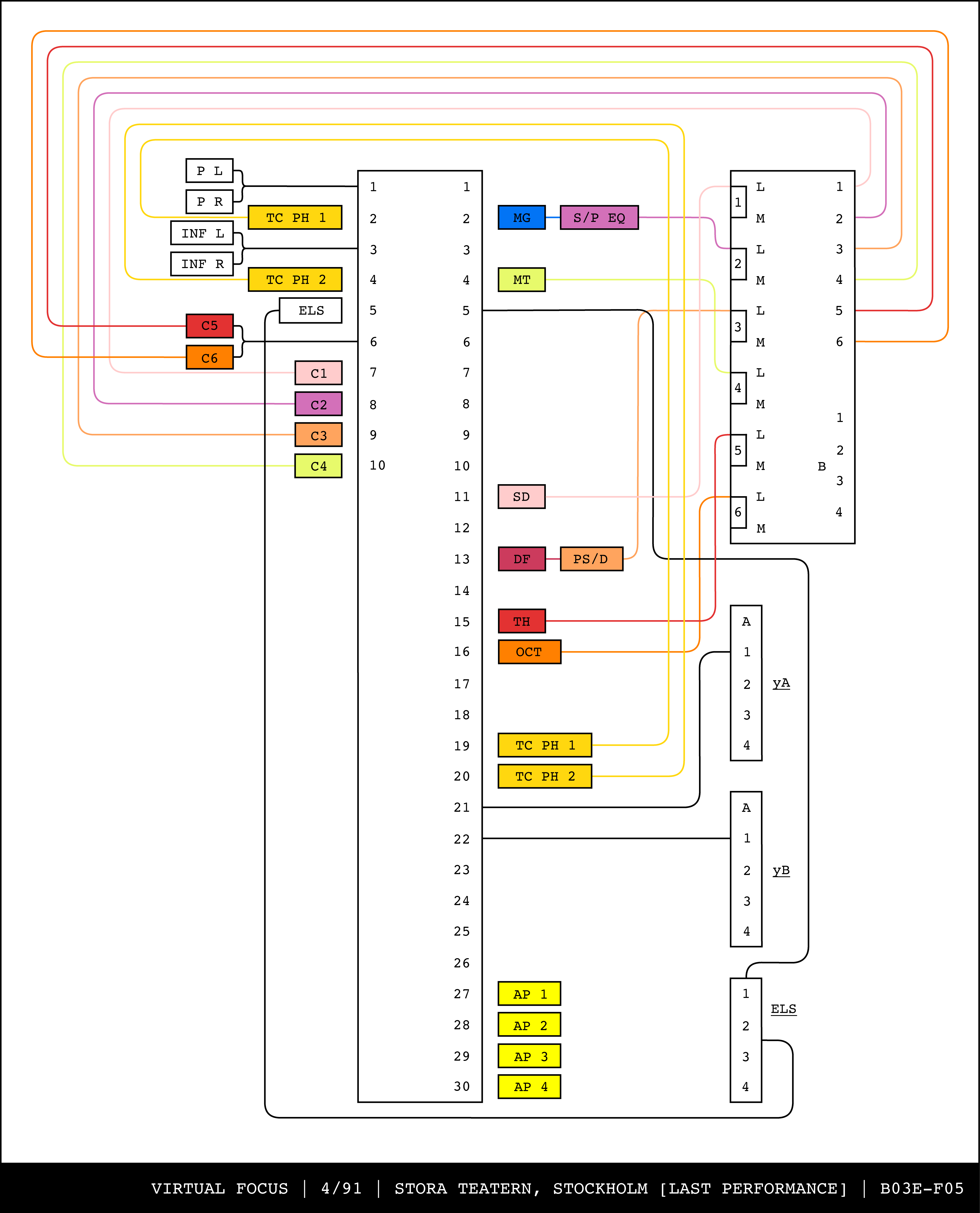 Re-drawing of Tudor's matrix maps (list of inputs and outputs to matrix switchers and mixers) in the form of connection diagrams (limited to maps with specific dates).