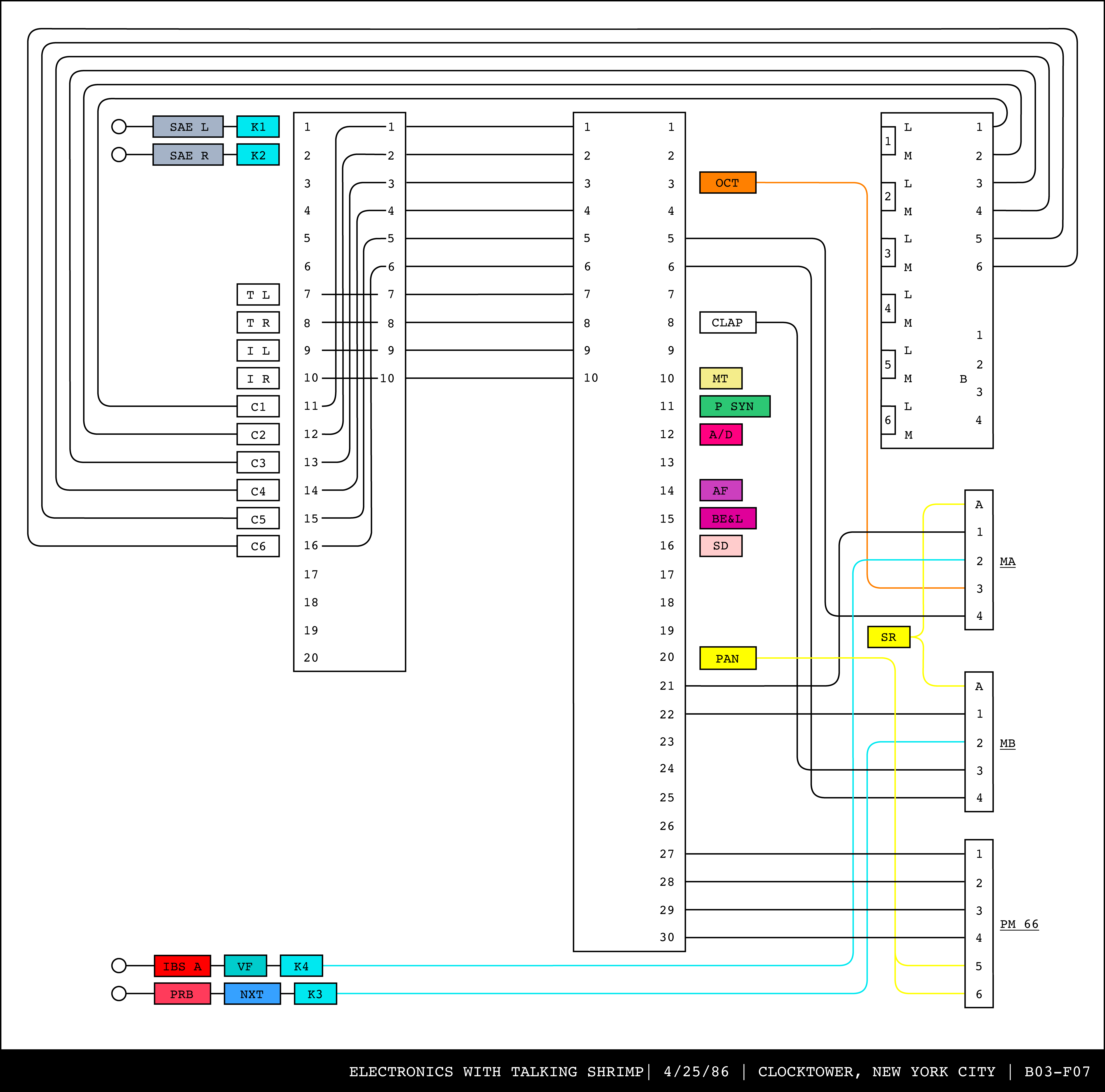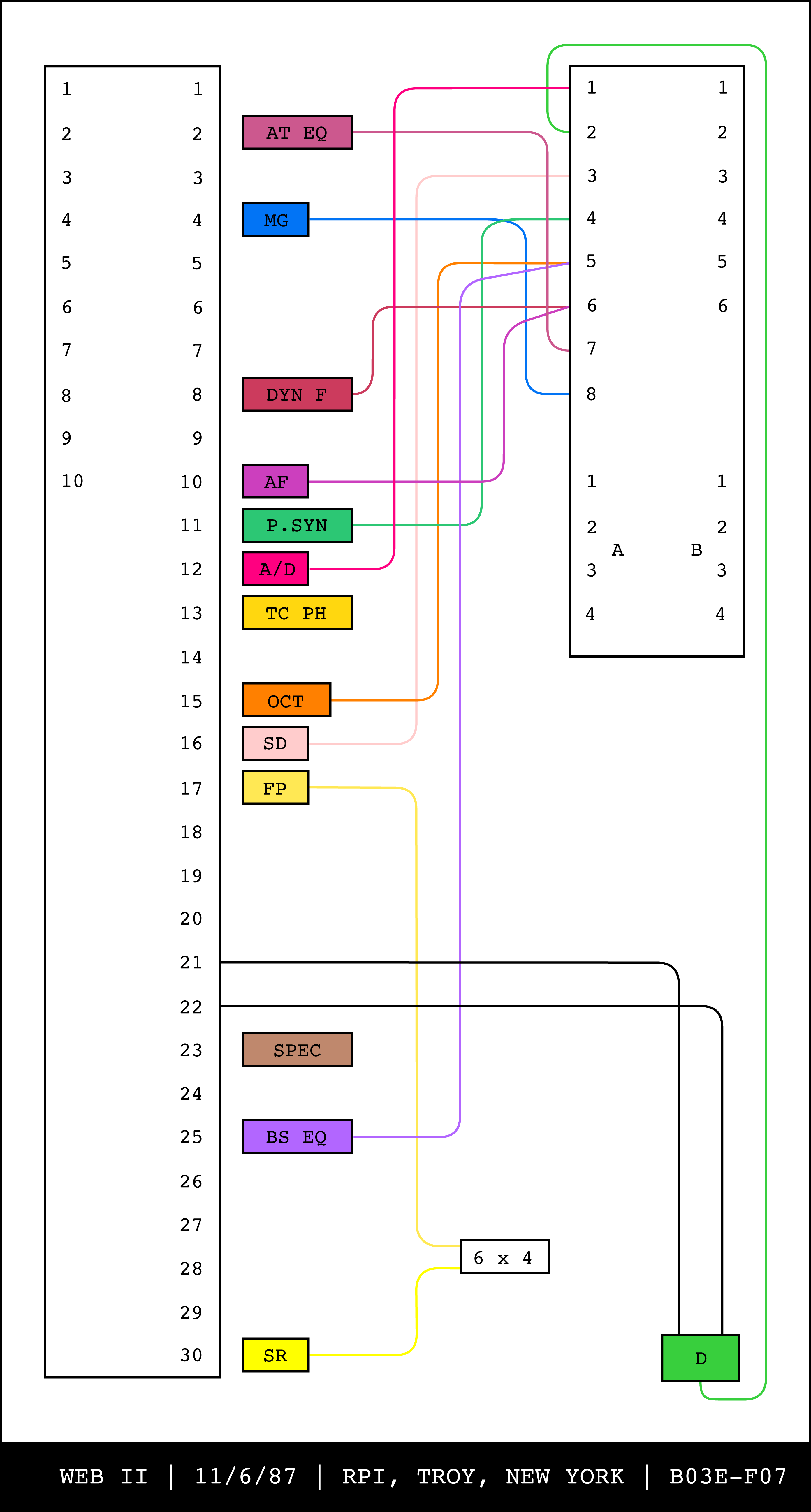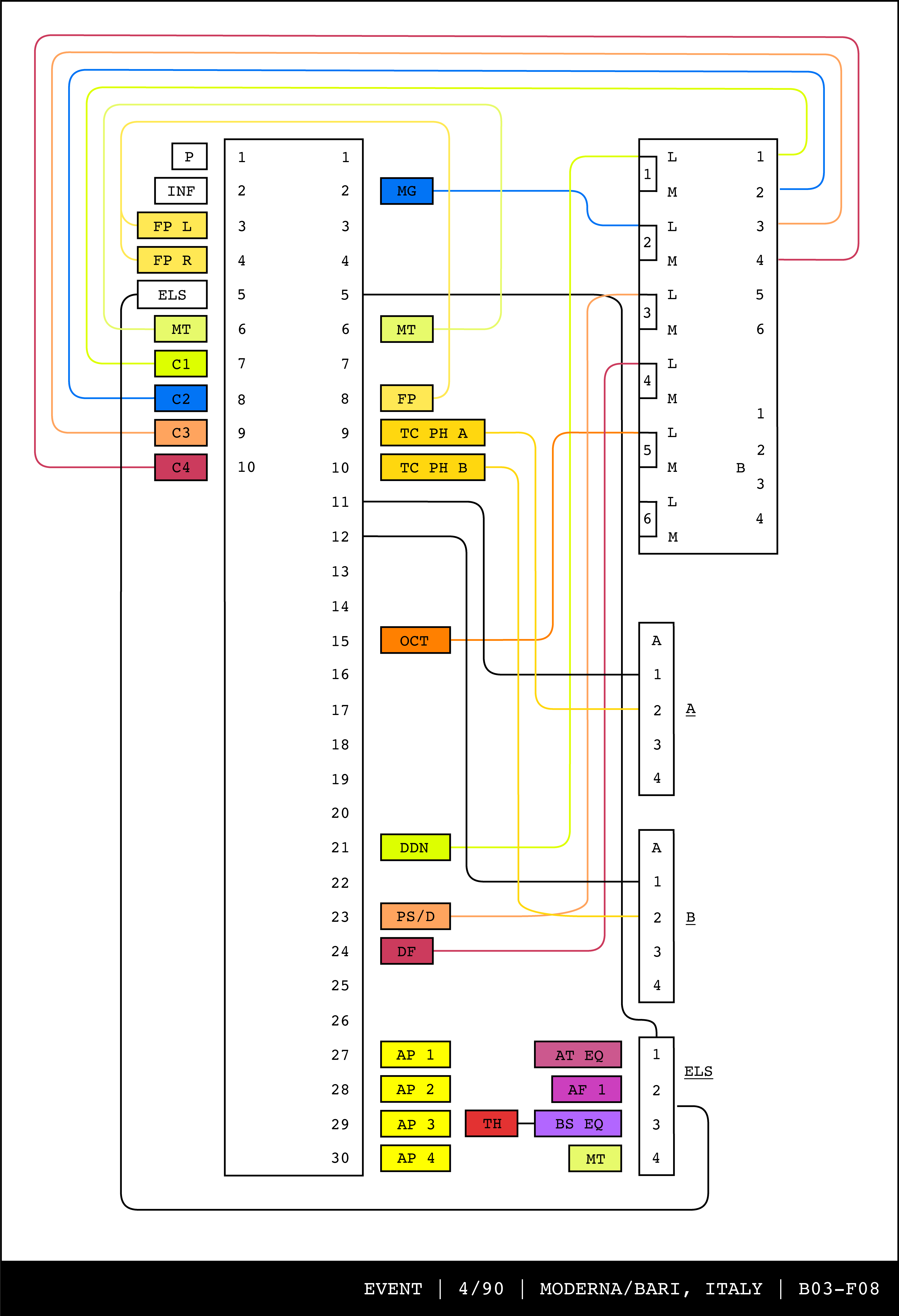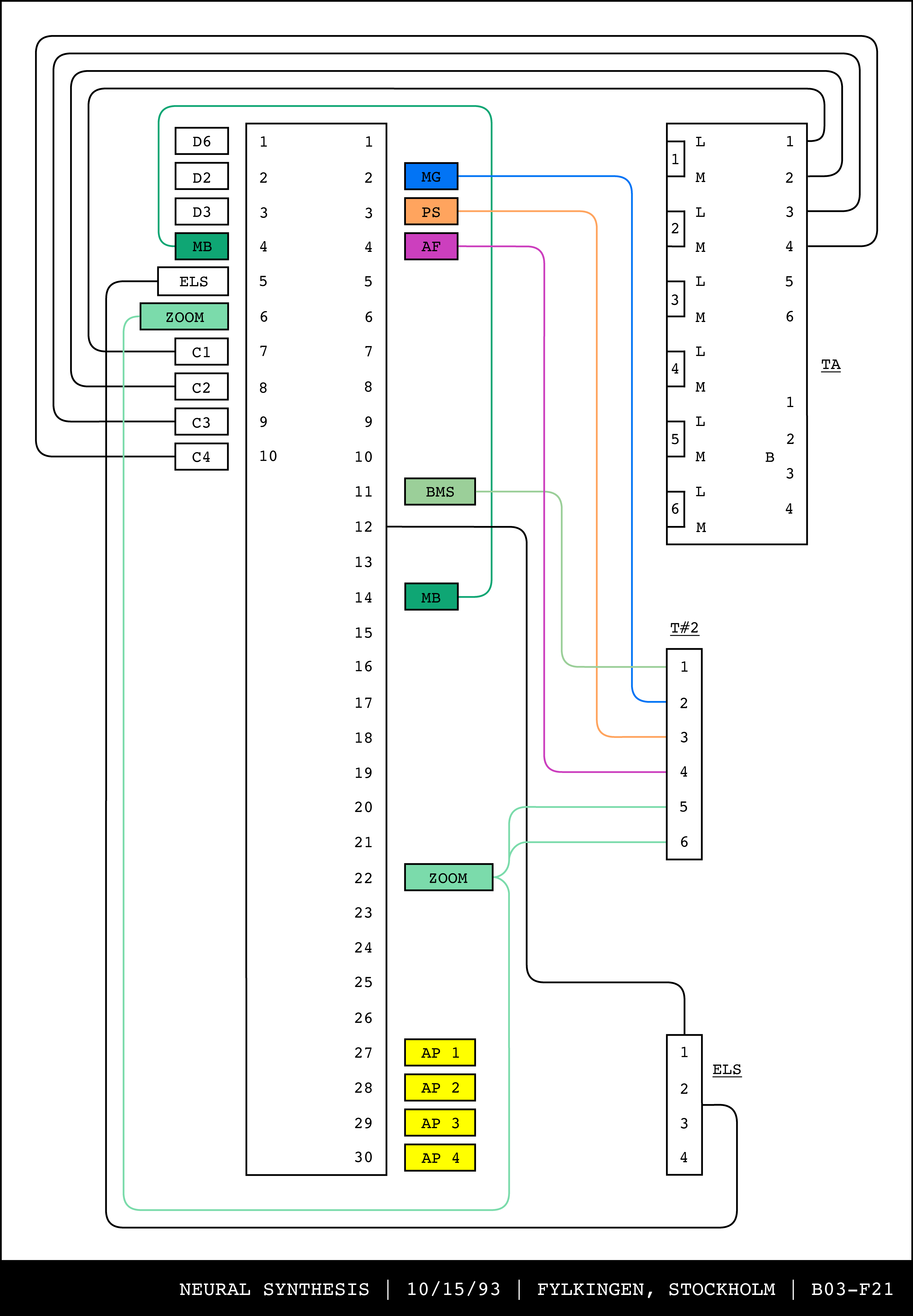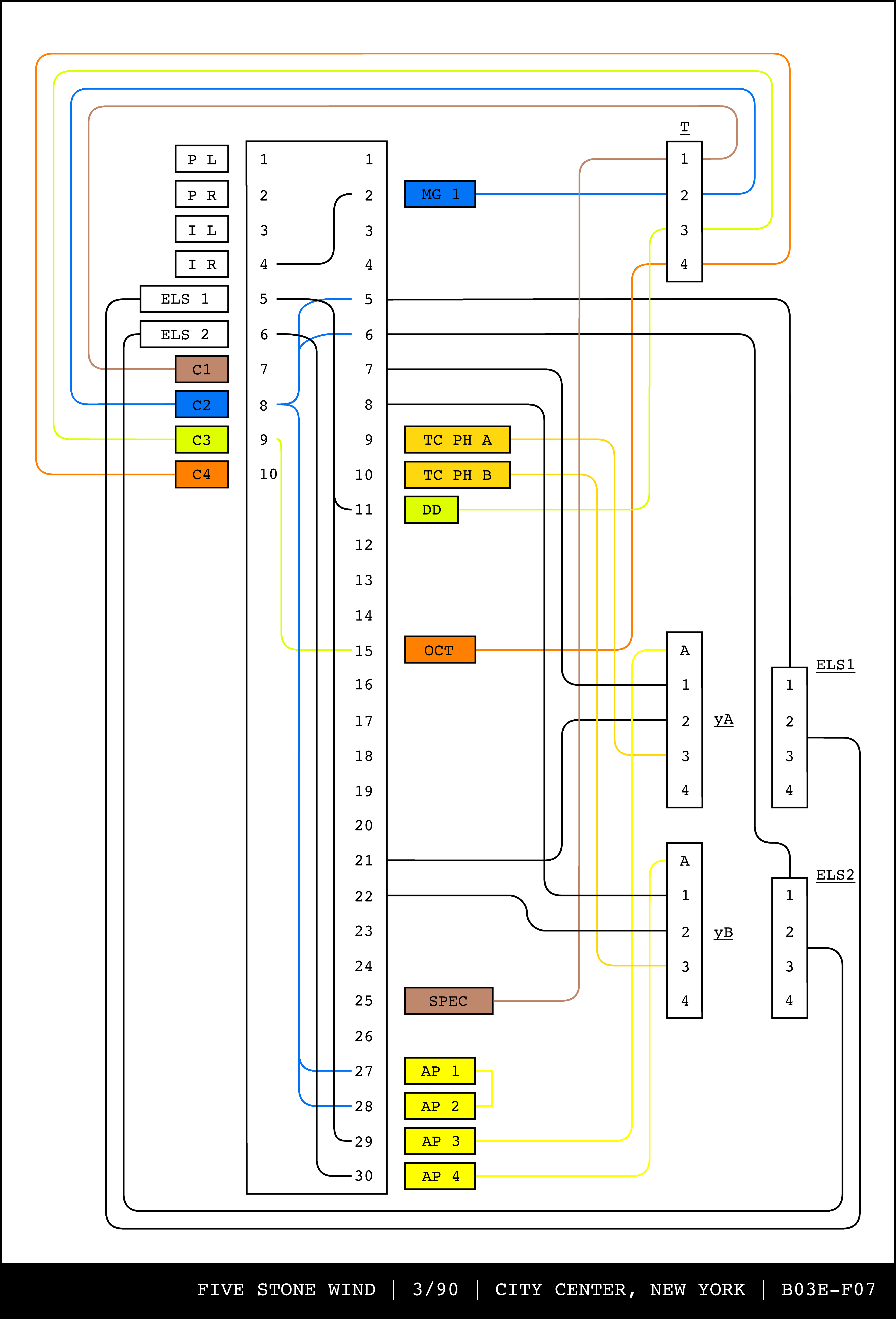 Re-drawing of Tudor's matrix maps (list of inputs and outputs to matrix switchers and mixers) in the form of connection diagrams (limited to maps with specific dates).