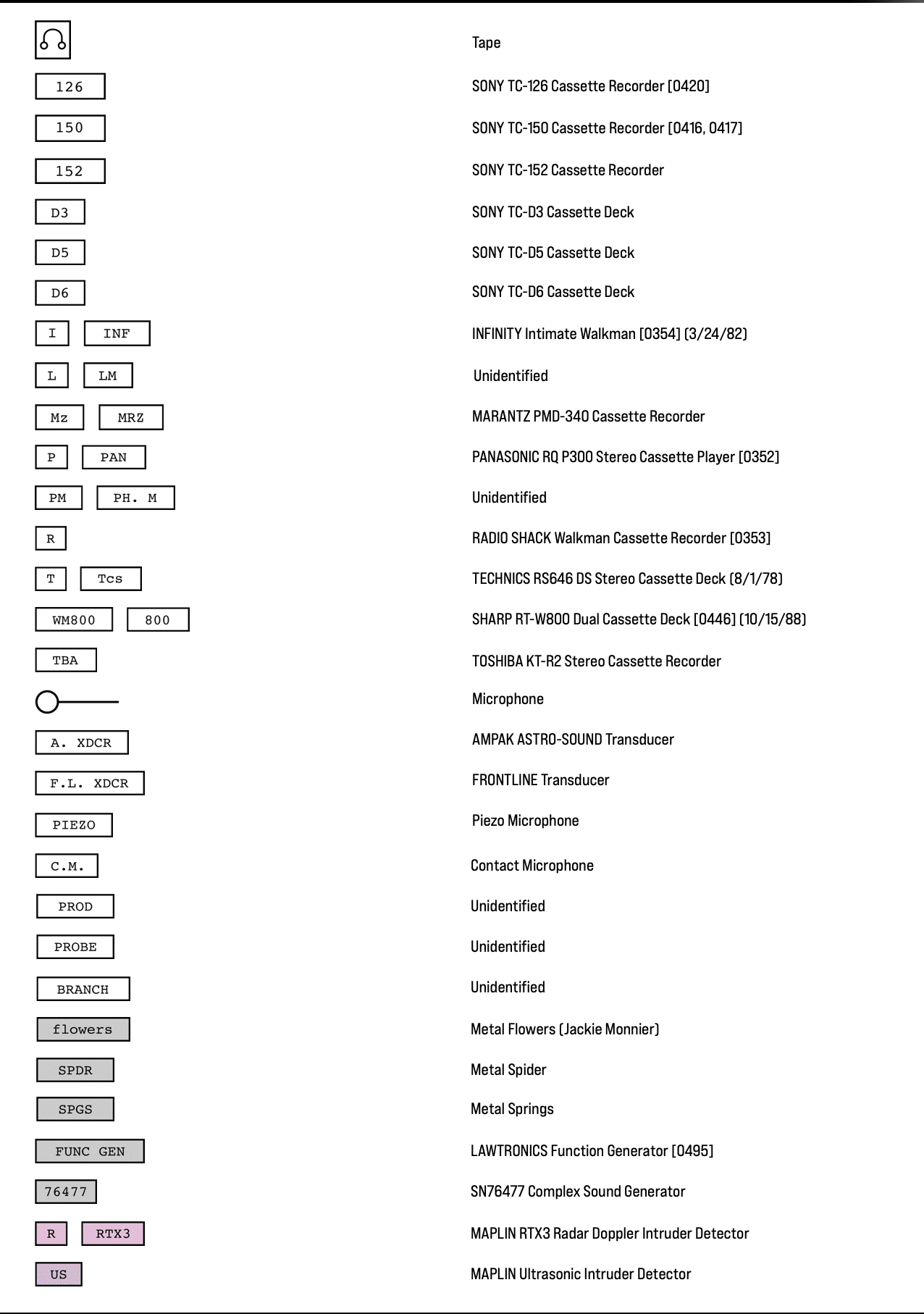 Legends write out the instrument names of Tudor's acronyms, followed by their archive number assigned by Matt Rogalsky. "B-F" refers to box/folder location of the original Matrix Map in the David Tudor Papers at the Getty Research Institute.